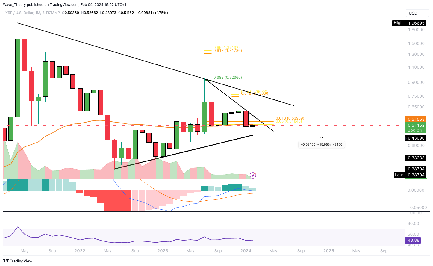 Der Ripple Kurs befindet sich an der wichtigen 50-Monate-EMA Unterstützung am Golden Ratio Niveau bei rund 0,515 USD. Wenn diese Unterstützung bricht, könnte der Ripple Preis rund 16 % fallen.