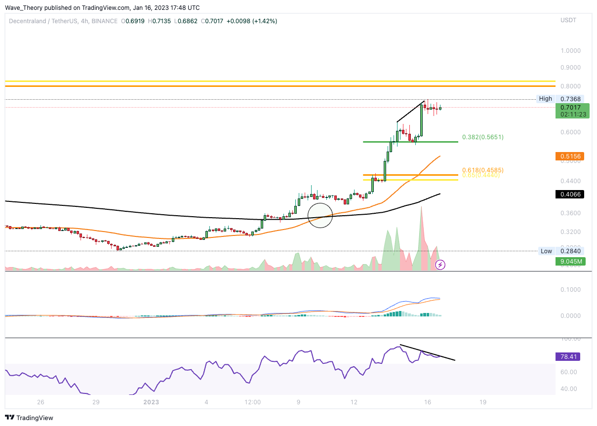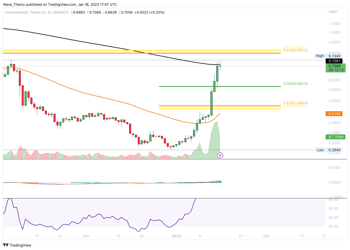 Der Decentraland Kurs erreichte den 200-Tage-EMA bei rund 0,708 USD, woran MANA jetzt auf Widerstand stößt. Sollte MANA daran bärisch abgewiesen werden, warten bei rund 0,56 USD und bei rund 0,455 USD die nächsten signifikanten Fibonacci Unterstützungen.