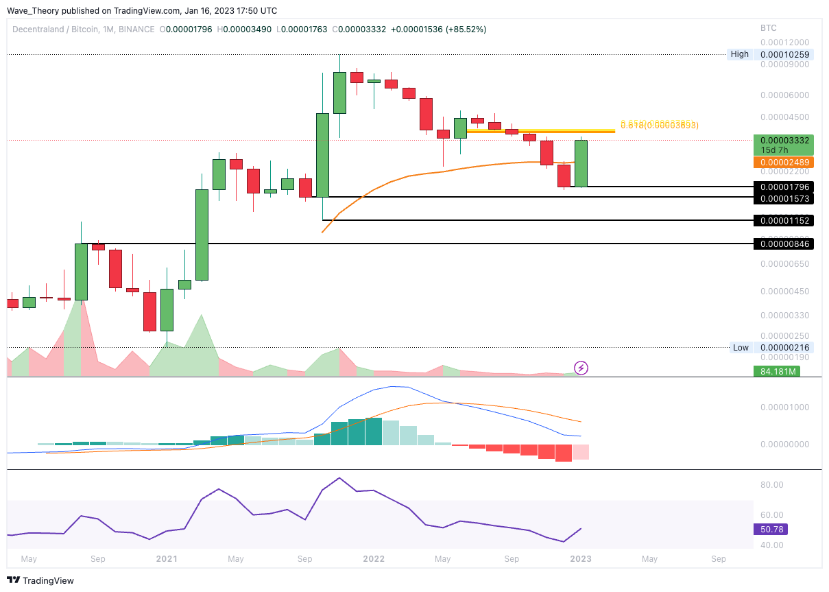 Mit dem Bruch der Golden Ratio bei rund 0,00007 BTC befindet sich MANA in einem neuen Bullentrend gegen BTC. Darüber hinaus beginnt das Histogramm des MACDs in diesem Monat bullisch höher zu ticken.
