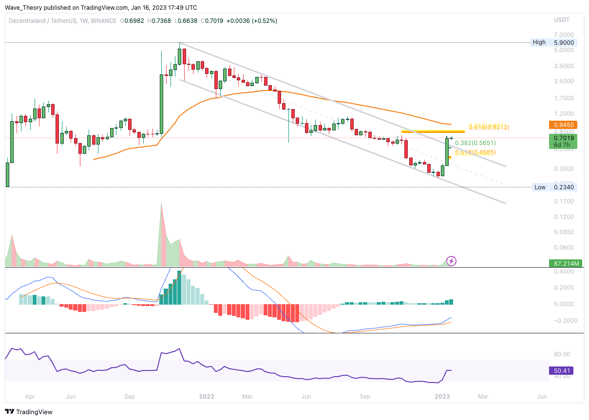 Im Wochenchart ist der MANA Kurs aus dem parallelen Abwärtskanal bullisch ausgebrochen. Bricht MANA auch die Golden Ratio bei rund 0,8 USD, wartet am 50-Wochen-EMA bei rund 0,945 USD der nächste signifikante Widerstand.