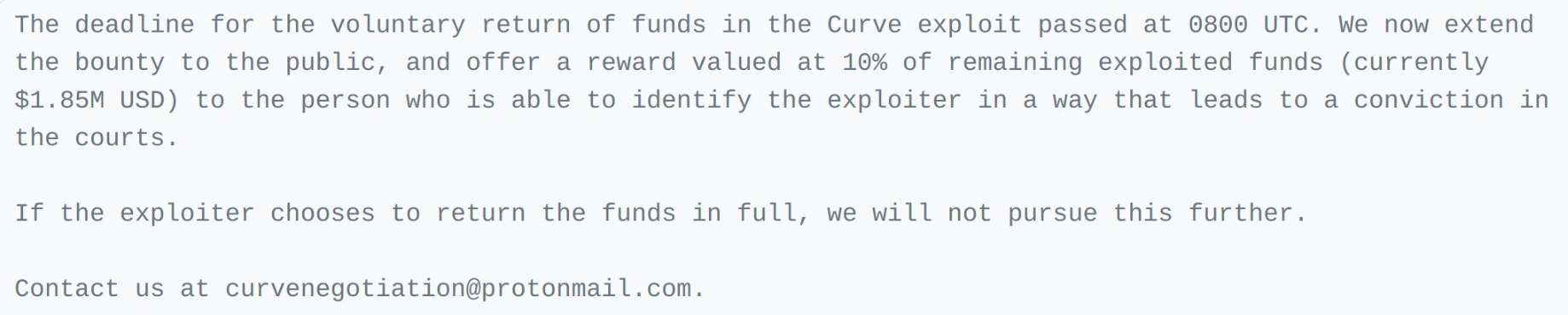“Die Frist für die freiwillige Rückgabe von Geldern im Curve-Exploit ist um 08:00 UTC abgelaufen”, sagte Curve Finance in einer Blockchain-Transaktion.