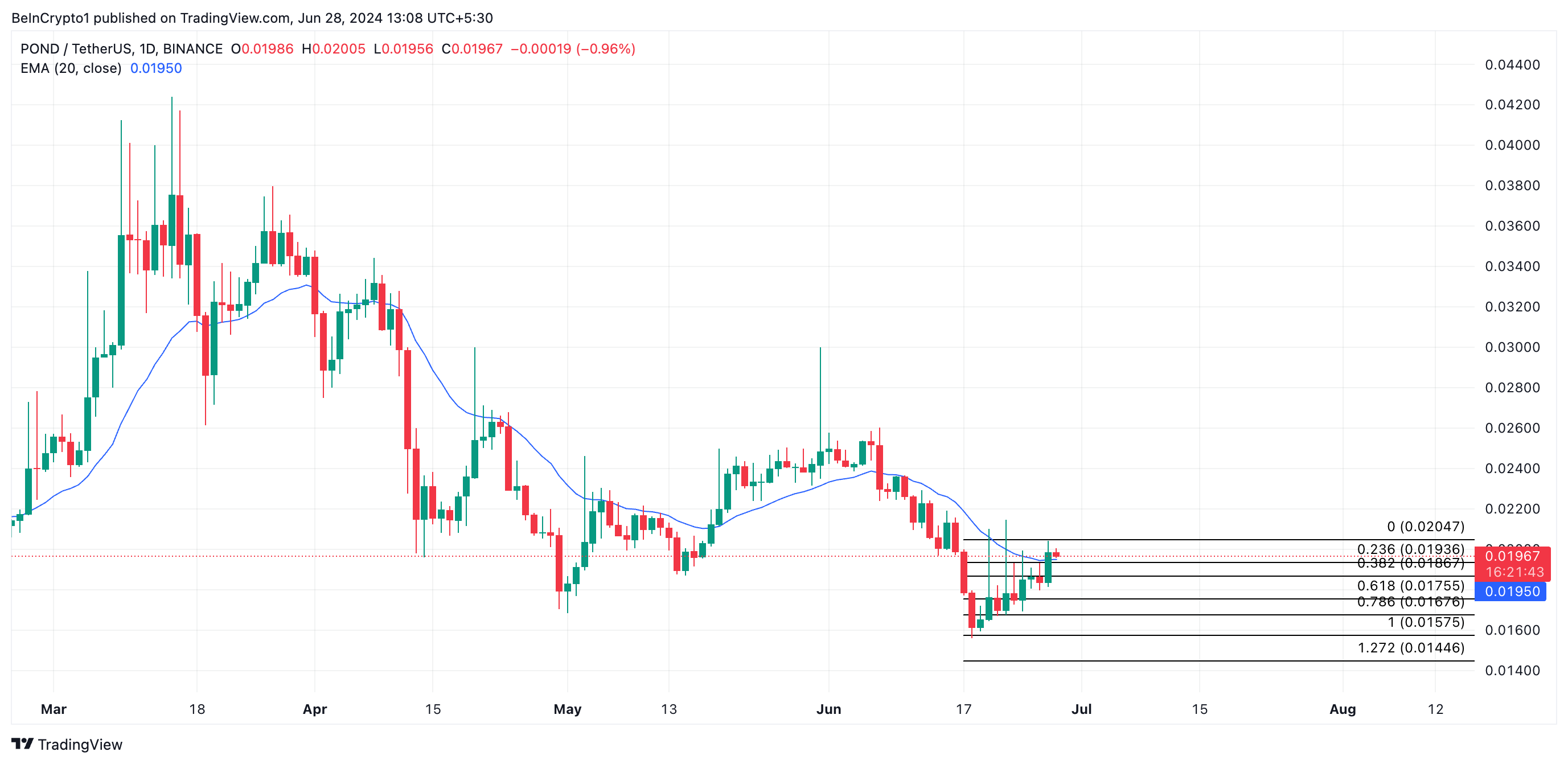 Sollte POND sich also über dem 20-Tage-EMA halten und der Aufwärtstrend sich fortsetzen, könnte der Kurs bis auf auf 0,02 USD steigen. Falls die bärische Tendenz gegenüber dem Token jedoch zunimmt, könnte der Kurs bis auf 0,01 USD fallen.