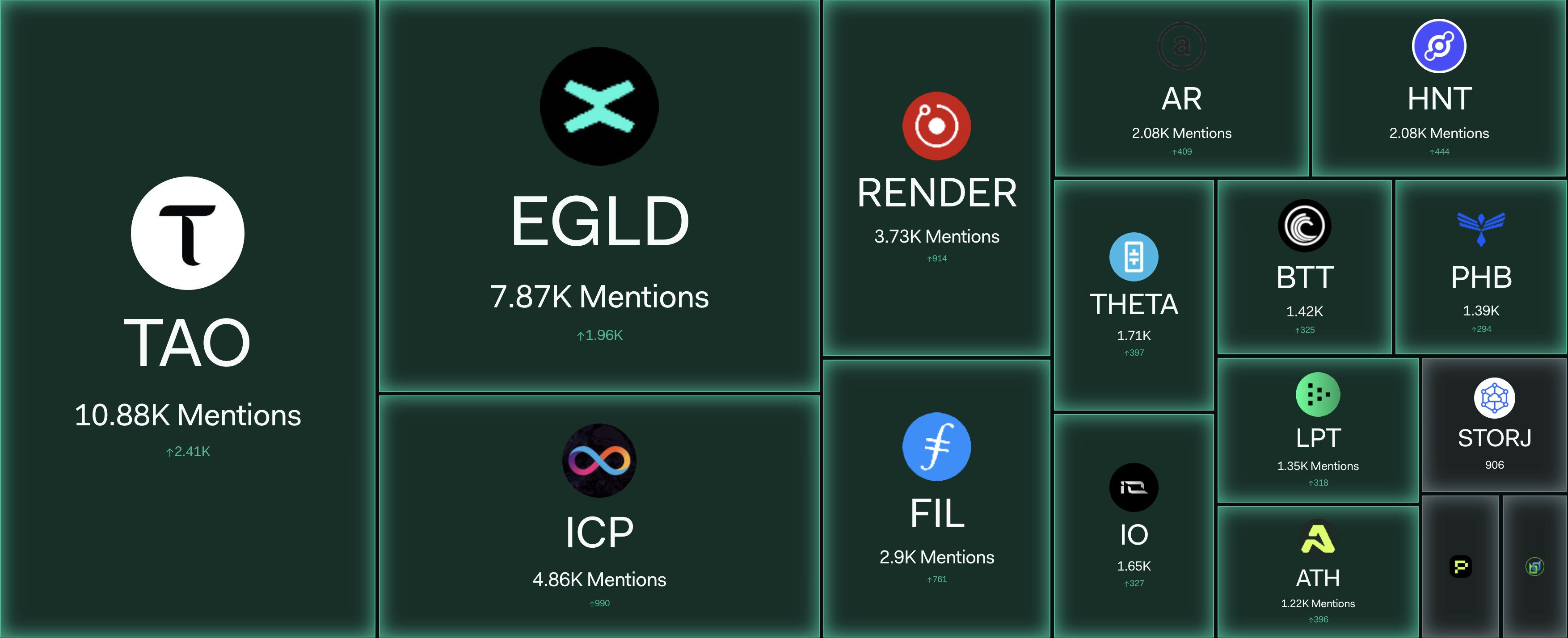 Die Analyseplattform LunarCrush hat Einblicke in die Top-DePIN-Projekte nach täglichen sozialen Erwähnungen geteilt. Bittensor (TAO) führte die Liste mit 10.880 Erwähnungen an, was einen bemerkenswerten Anstieg von 2.410 zeigt und starkes Interesse der Community anzeigt.