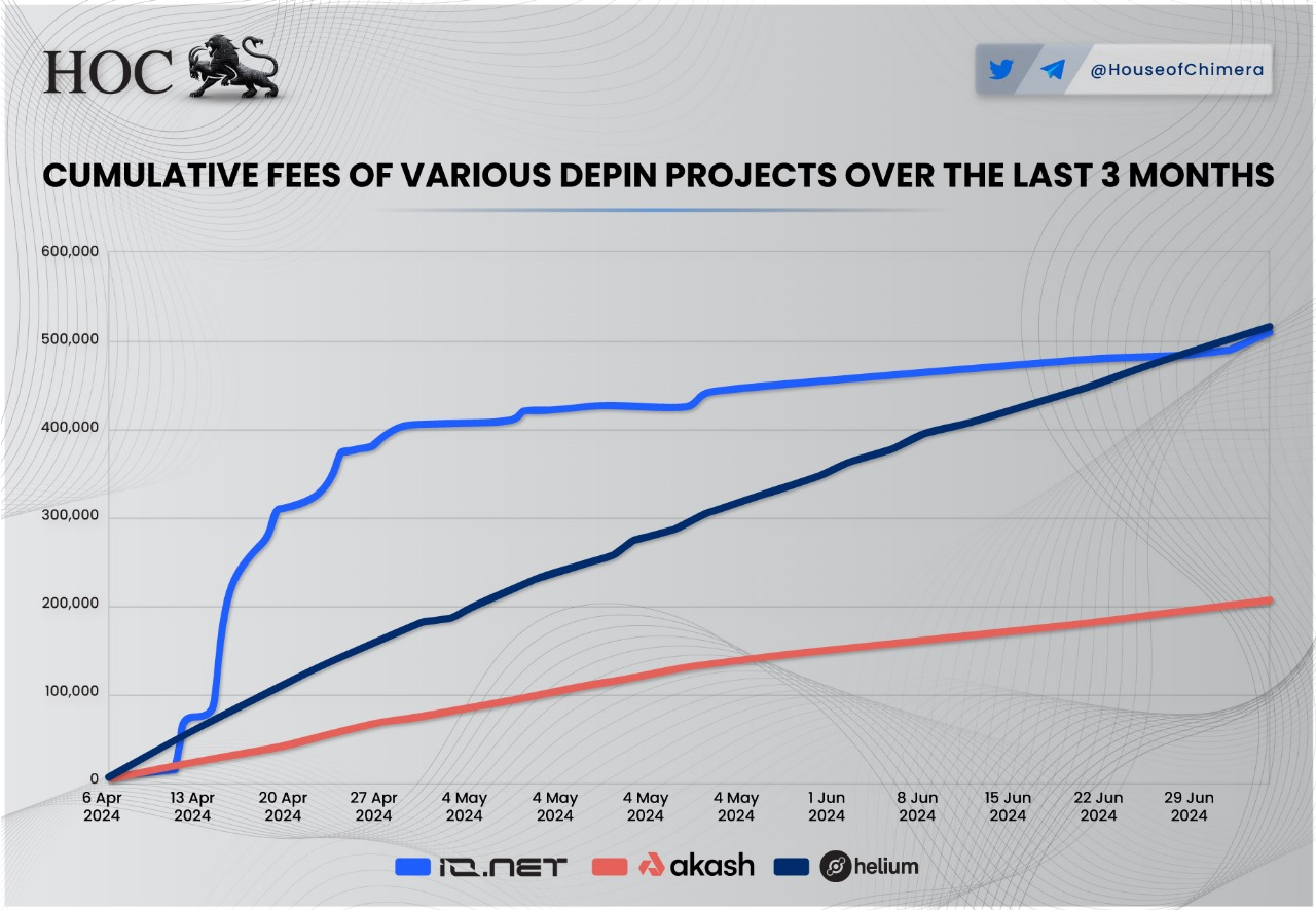 Wie neueste Daten von House of Chimera zeigen, generierten io.net (IO), Helium (HNT) und Akash Network in den letzten drei Monaten die meisten Gebühren. Während Io.net und Helium jeweils 500.000 USD einnehmen konnten, beliefen sich die Gewinne von Akash Network auf über 200.000 USD.