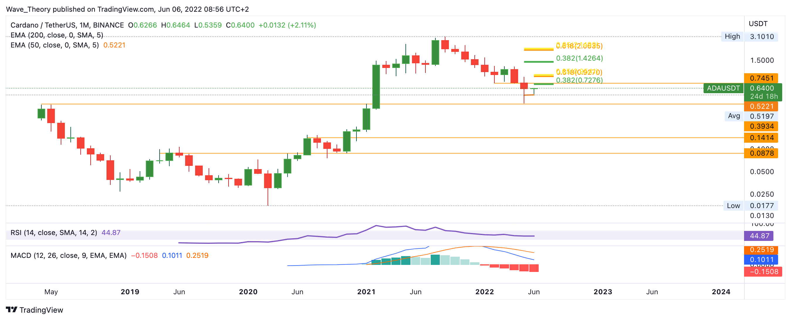 “Wenn der ADA Kurs in dieser Woche über dem 200-Wochen-EMA bei rund 0,54 USD schließt, läge damit eine Bullish-Engulfing-Kerze vor; eine bullische Kerzenformationen. Damit stünden die Chancen hoch, dass Cardano seine Aufwärtsbewegung in Richtung der Fibonacci Widerstände fortsetzt.