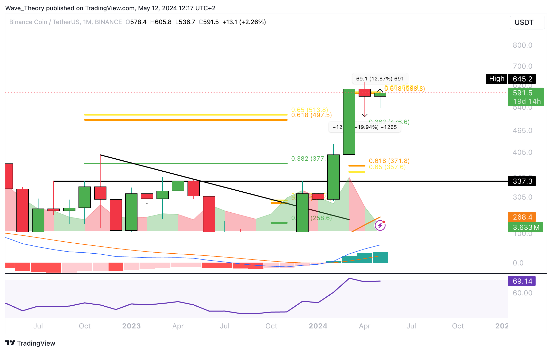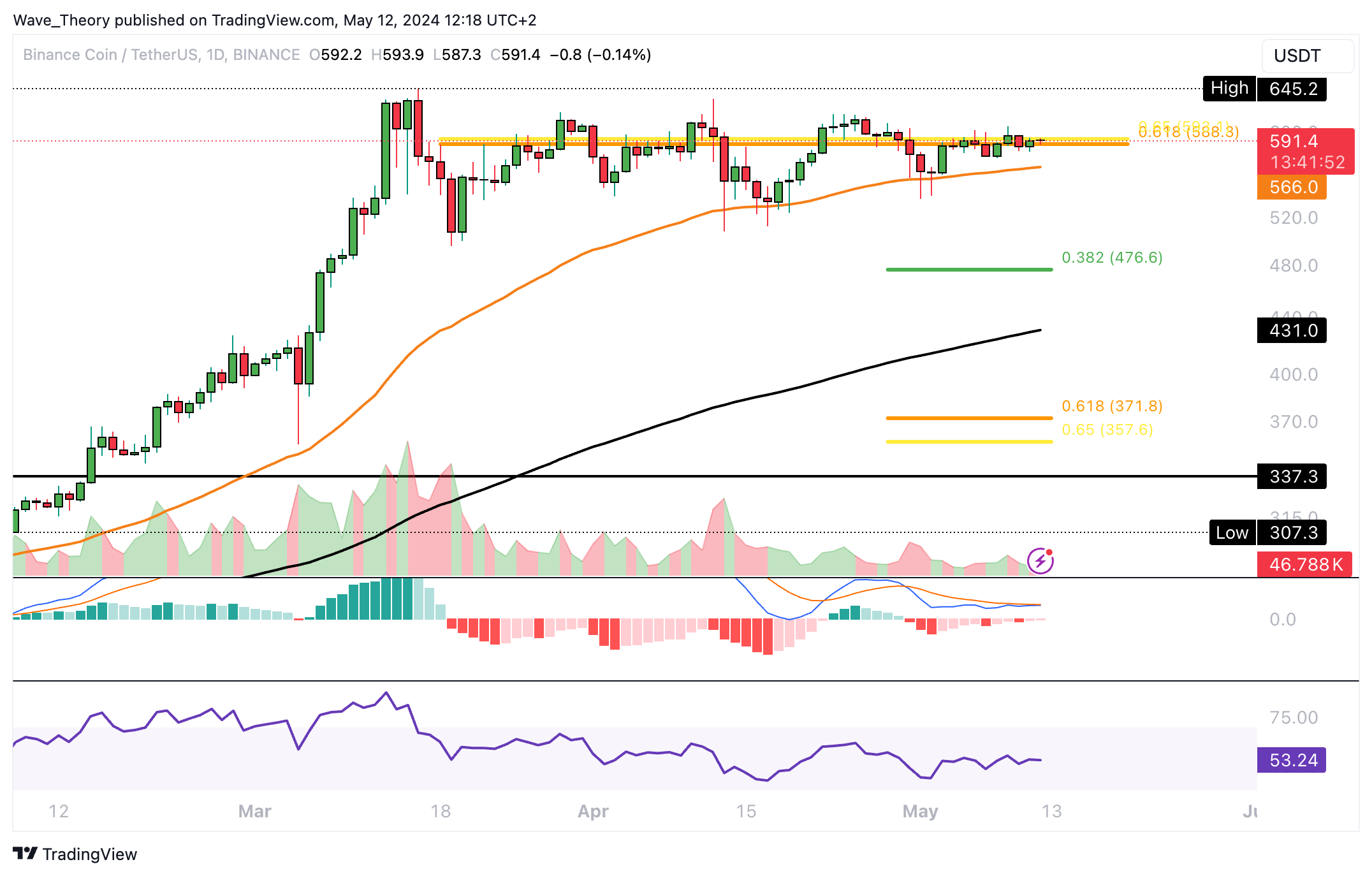 Derzeit befindet sich BNB am Golden Ratio Widerstand bei rund 590 USD. Mit einem bullischen Bruch könnte BNB das letzte Hoch bei rund 645 USD anvisieren.