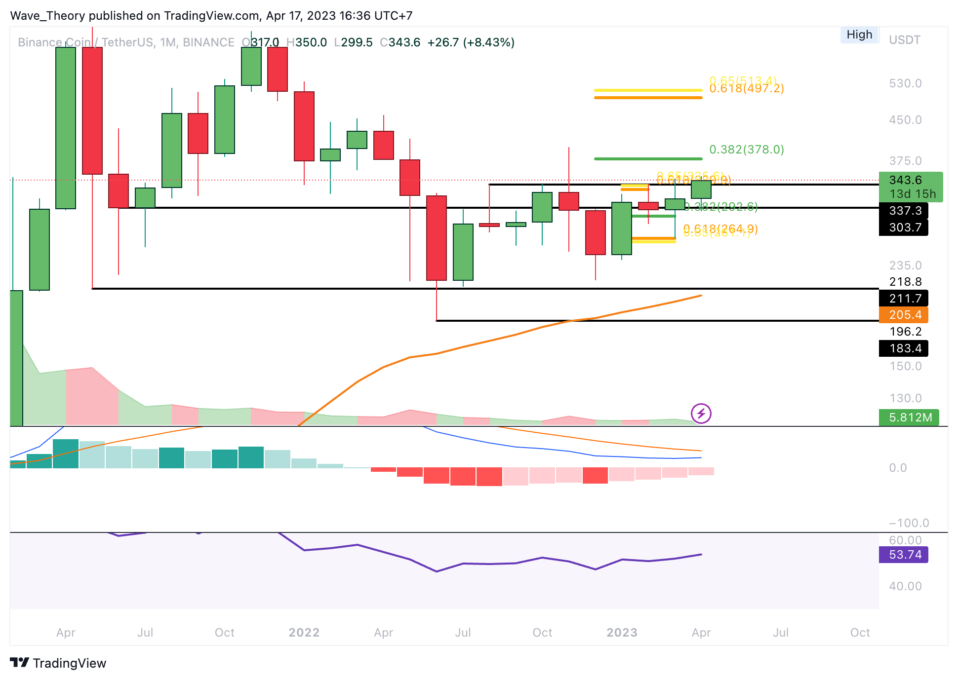 Sollte BNB den 0,382 Fib Widerstand bei rund 378 USD bullisch brechen, wartet an der 500 US-Dollar Marke der entscheidende Fibonacci Widerstand. Denn mit dem Bruch der Golden Ratio bei rund 500 USD befindet sich BNB in einem neuen Bullenzyklus.