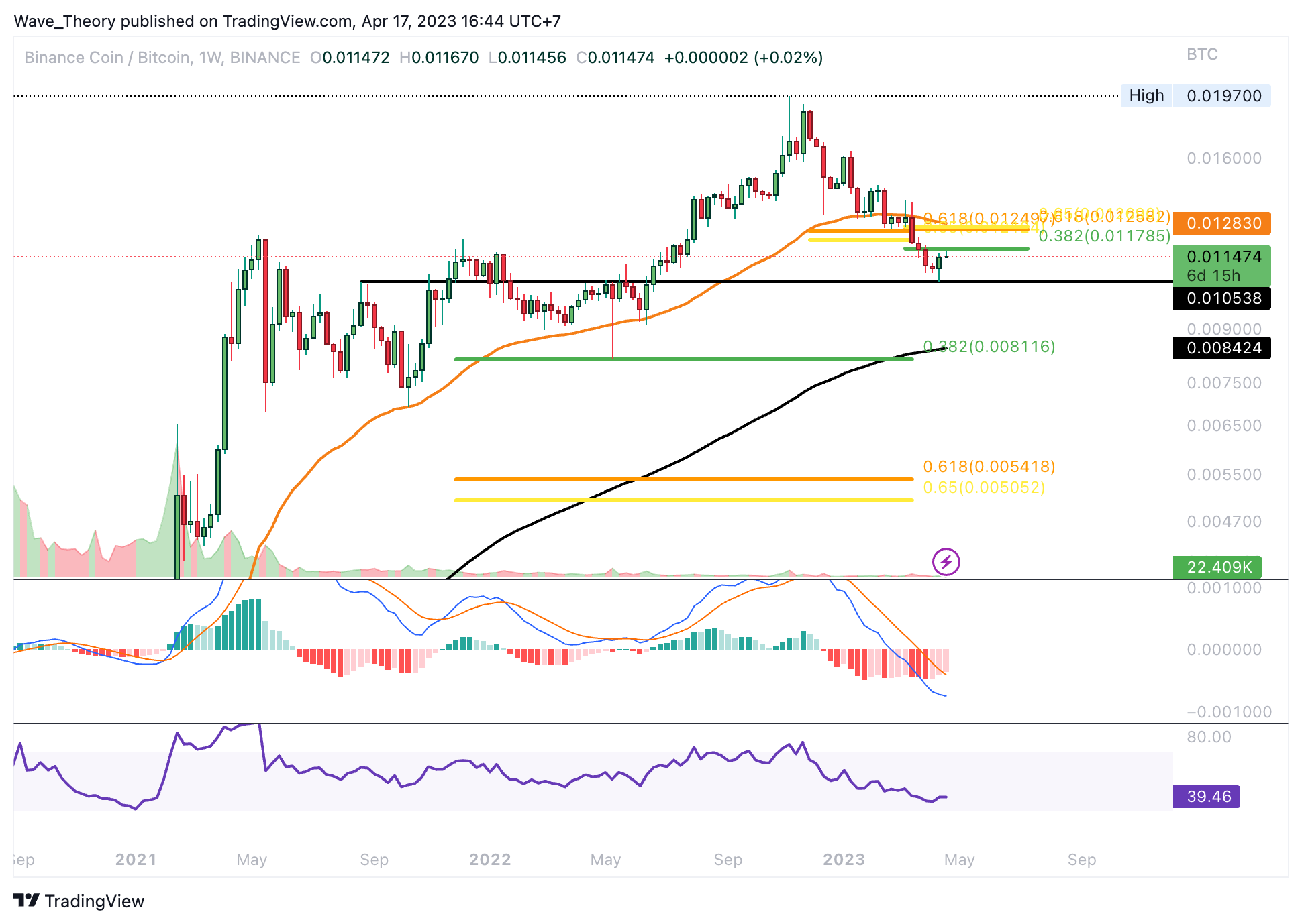 Gegen BTC ist der Binance Coin Kurs zunächst bärisch ausgebrochen. Denn BNB durchbrach die Golden Ratio Unterstützung bei rund 0,0125 BTC bärisch, um zur horizontalen Unterstützung bei rund 0,0105 BTC zu korrigieren. Dort konnte BNB sehr stark abprallen, wodurch BNB zunächst davor bewahrt wurde, zur 0,382 Fib Unterstützung am 200-Wochen-EMA bei rund 0,0084 BTC zu korrigieren.