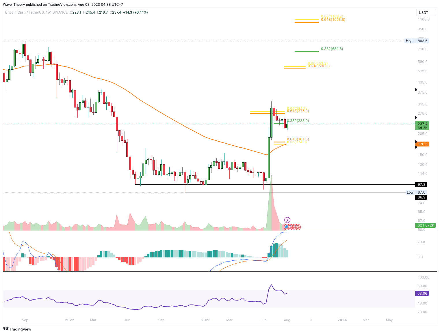 Bricht der BCH Kurs diesen Widerstand, wartet bei rund 267 USD der nächste signifikante Fib Widerstand auf den BCH Kurs. Mit dem Bruch der Golden Ratio bei rund 267 USD ist die Korrekturbewegung abgeschlossen.