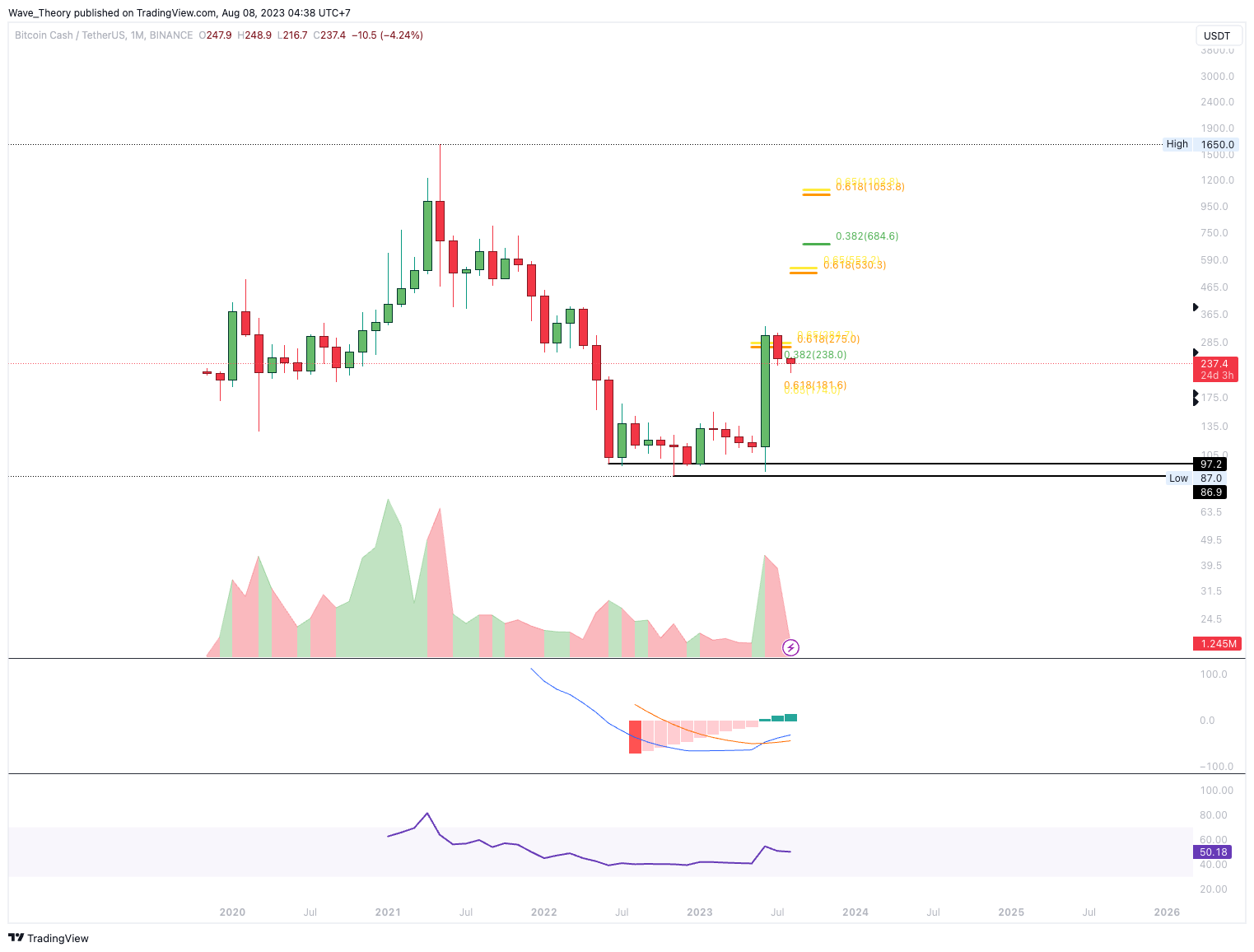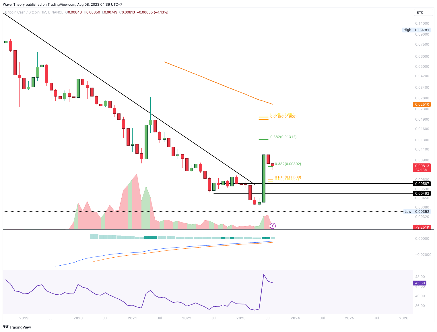 Das Histogramm des MACDs beginnt in diesem Monat bisher bärisch tiefer zu ticken, nachdem es die letzten zwei Monate bullisch höher ticken konnte. Die MACD Linien sind dabei aber noch bullisch überkreuzt. Insgesamt gibt es definitiv noch bullische Hoffnung. Die Aufwärtsbewegung bleibt bullisch intakt, solange sich Bitcoin Cash über der Golden Ratio bei rund 0,0063 BTC hält.