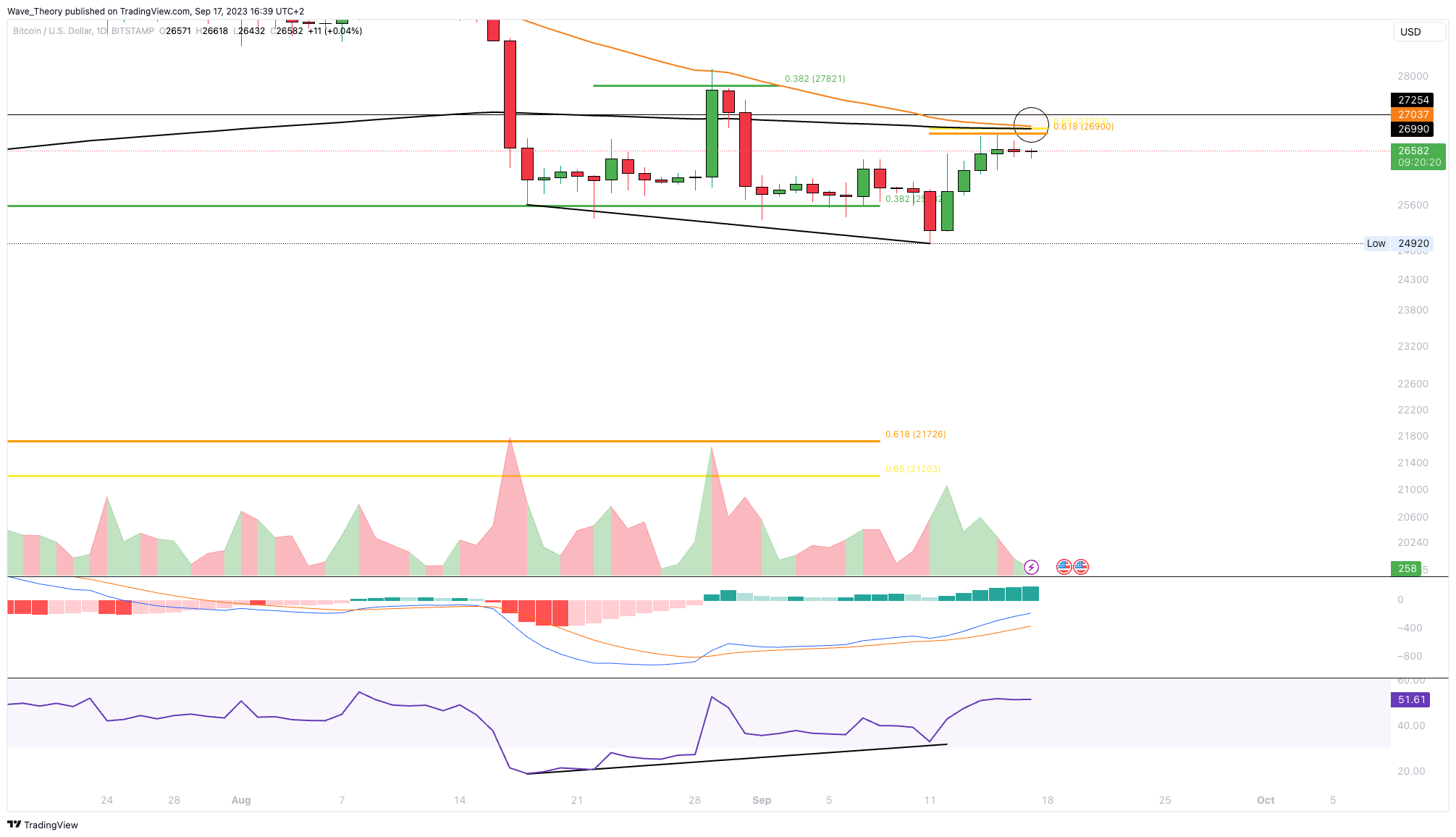 Im Tageschart konnte sich vor einigen Tagen eine bullische Divergenz im RSI abzeichnen, woraufhin der Kurs auch schon kräftig nach oben geschnellt ist. Doch bei rund 26.900 USD stößt Bitcoin auf signifikanten Golden Ratio Widerstand. Dort liegt zudem der 50-Monate-EMA. Nicht weit davon entfernt liegen zudem die 200-Tage- und 50-Tage-EMAs, welche als zusätzlicher Widerstand fungieren.