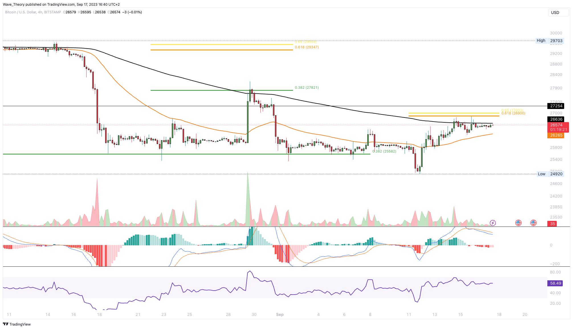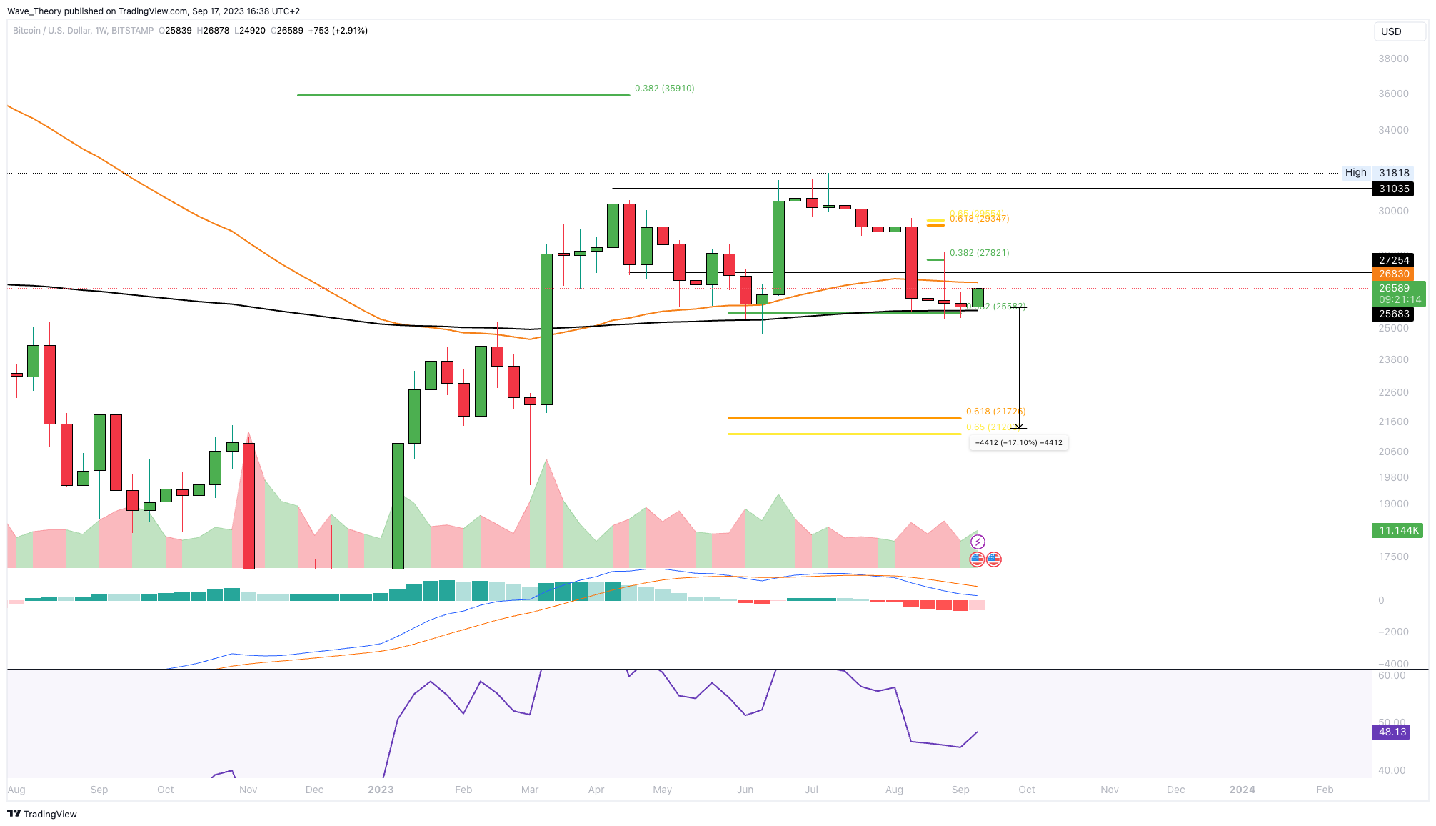 Falls die Unterstützung doch bricht, könnte der Bitcoin Kurs zur Golden Ratio Unterstützung bei rund 21.200 USD korrigieren. Das impliziert ein Abwärtspotenzial von rund 20 %. Doch jetzt befindet sich Bitcoin erst einmal in einer Aufwärtsbewegung. Damit stößt BTC jetzt am 50-Wochen-EMA bei rund 26.829 USD auf signifikanten Widerstand. Wenn Bitcoin diesen bricht, könnte der Kurs zum 0,382 Fib Niveau bei rund 27.821 USD oder gar bis zur Golden Ratio bei rund 29.500 USD steigen.