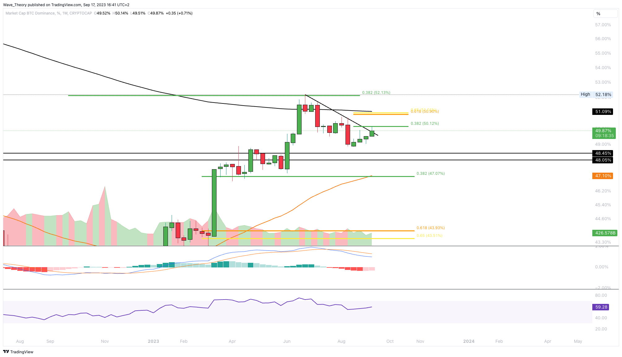 Wenn die Bitcoin Dominanz bärisch abgewiesen wird, wartet spätestens zwischen rund 48 % und 48,5 % signifikante Unterstützung auf Bitcoin. Ansonsten liegt am 50-Wochen-EMA bei rund 47 % die nächste signifikante Fib Unterstützung.