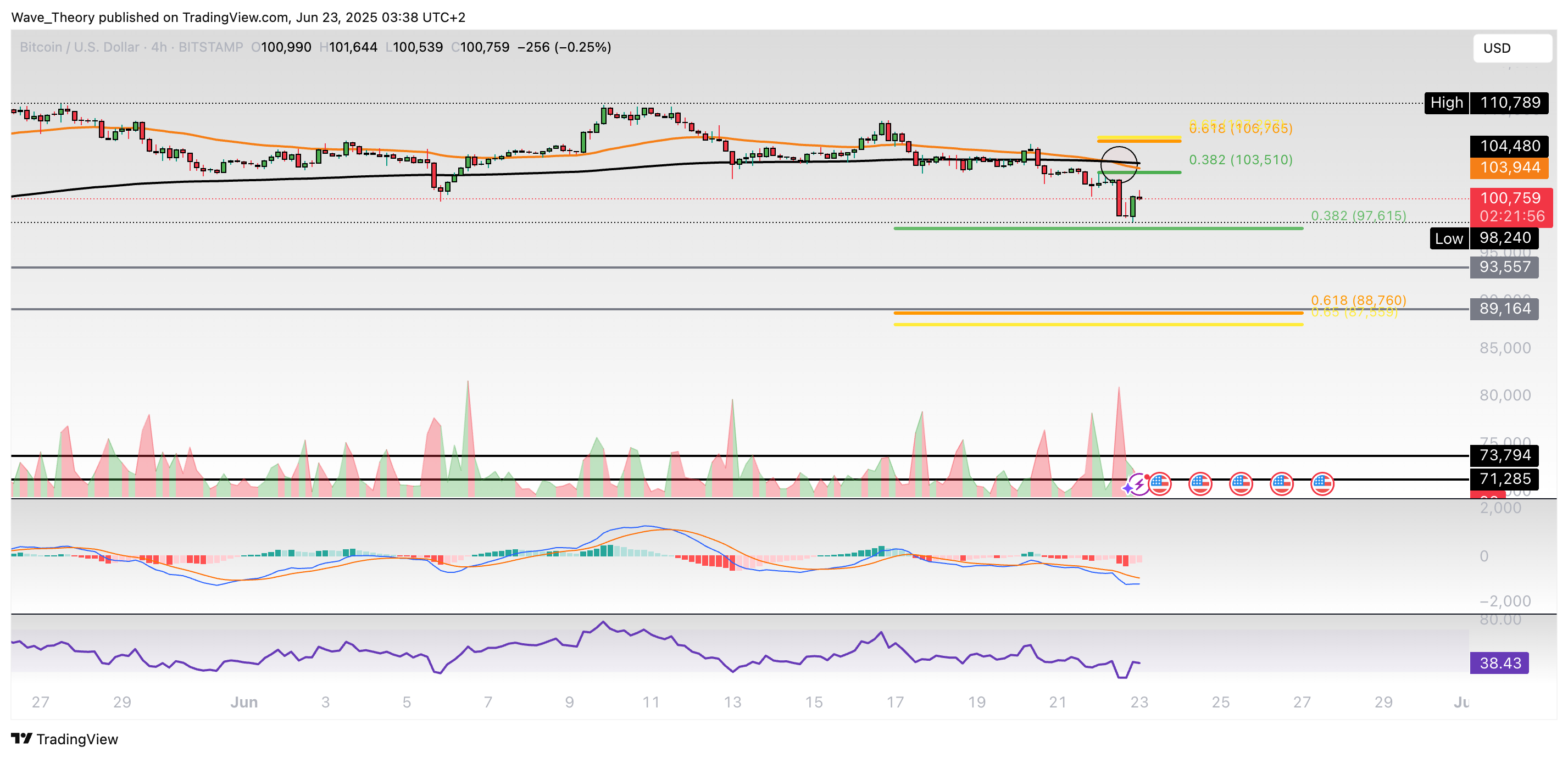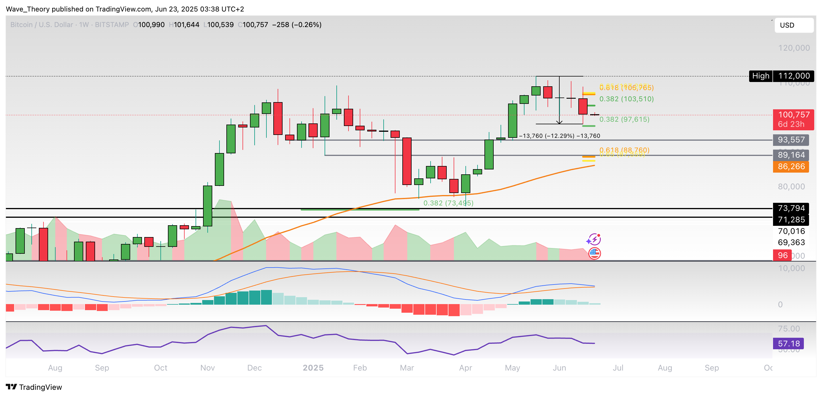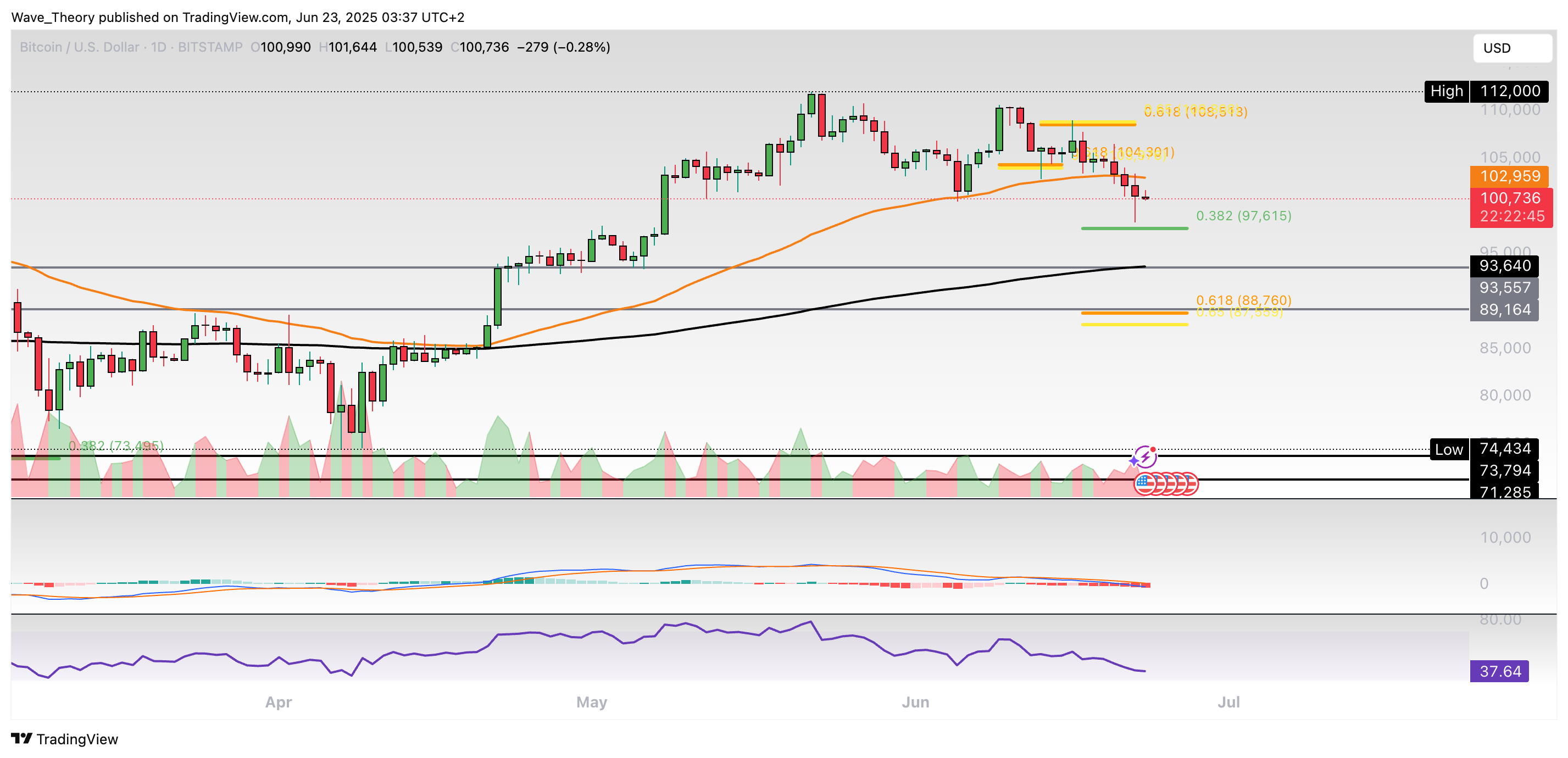 Bitcoin-Prognose für Montag, 23. Juni 2025: Letzte Woche warnten wir davor. Jetzt ist es geschehen: Der Bitcoin Kurs ist unter 100.000 USD gefallen.