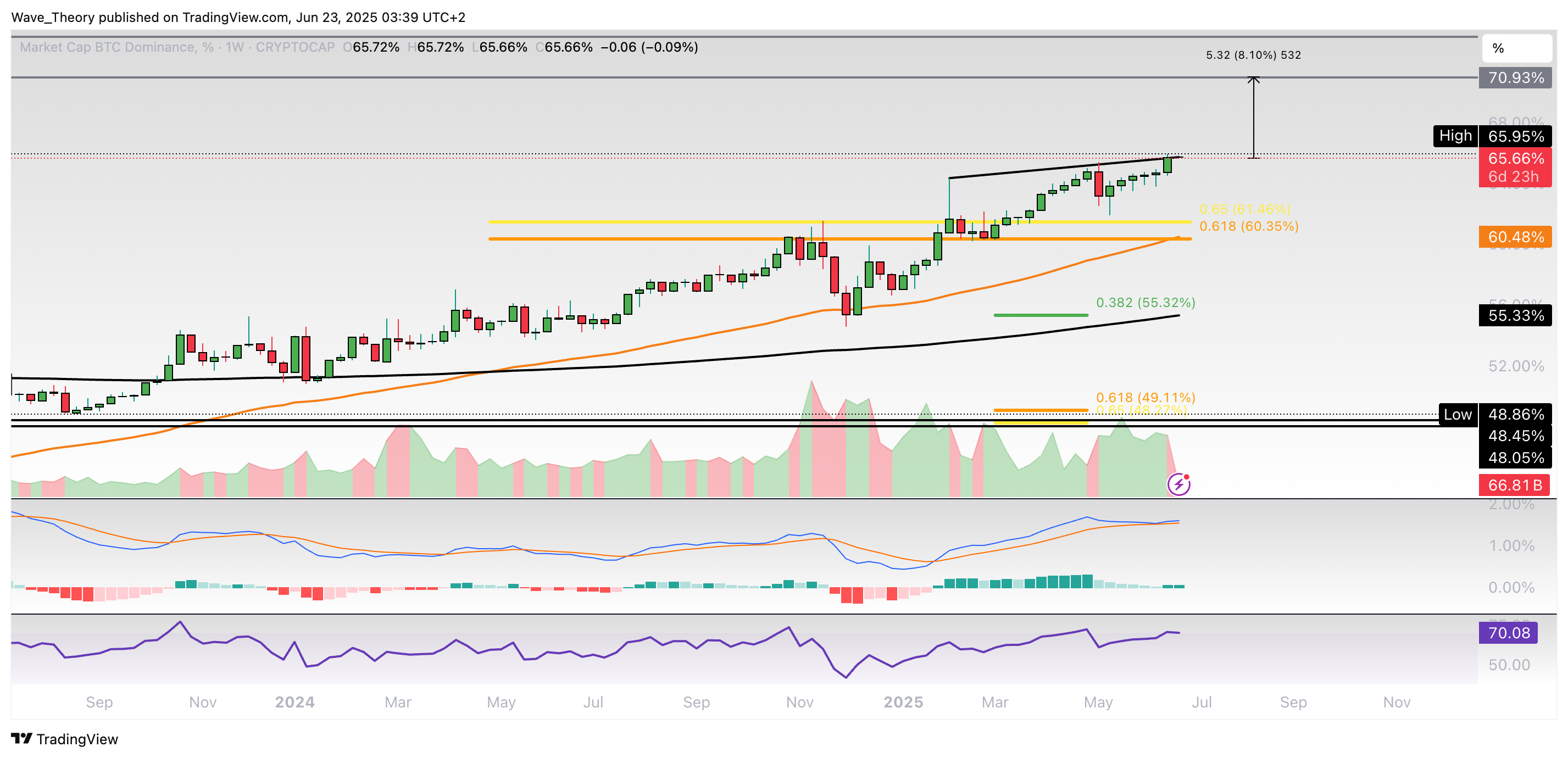 Die Bitcoin Dominanz steigt weiter. Sie könnte jetzt noch um weitere 8 % steigen, bis sie auf signifikanten Widerstand zwischen rund 71 % und 74 % stößt.