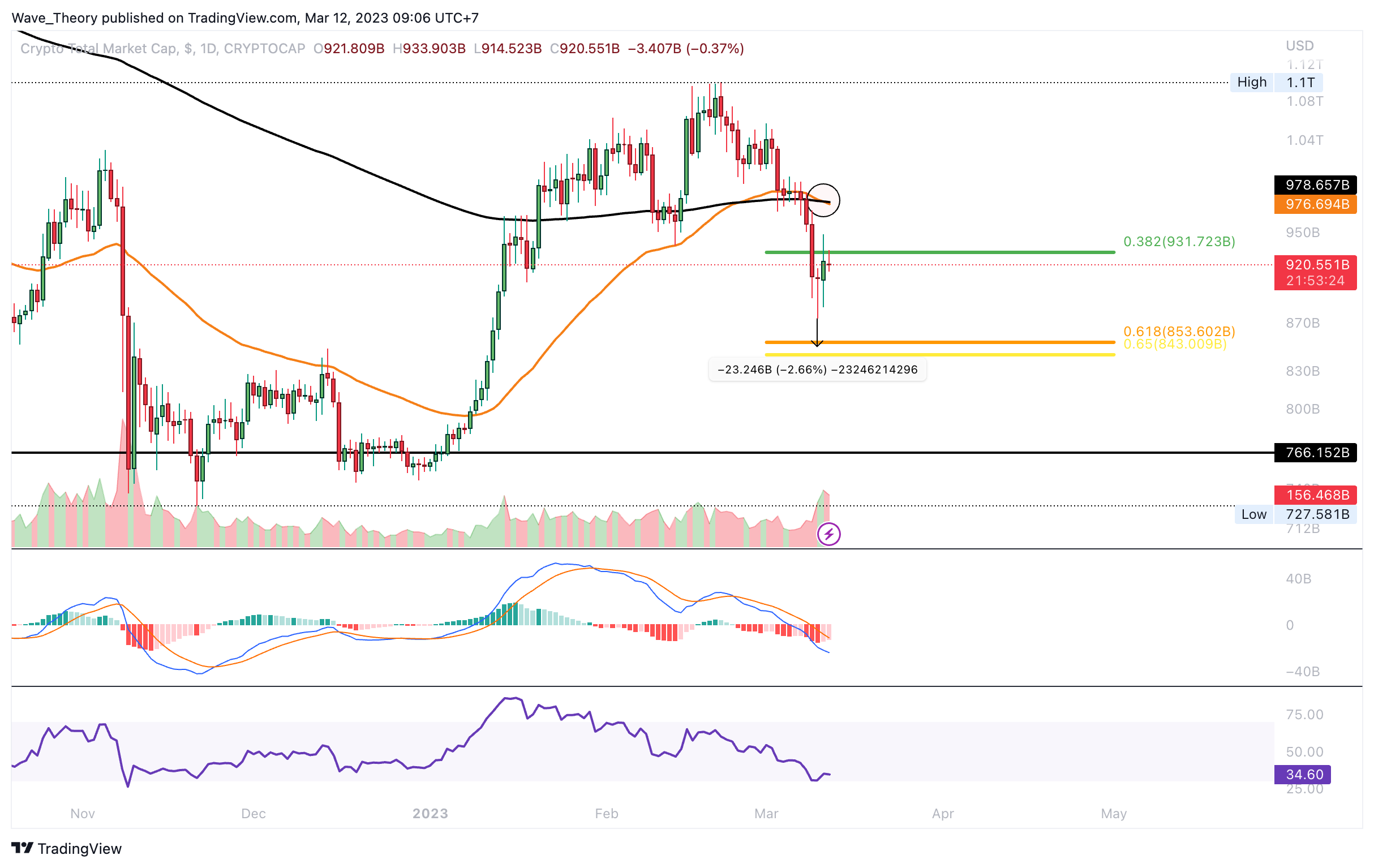 Damit wartet die nächste signifikanten Fib Unterstützungen bei rund 853 Milliarden USD. Bisher konnte der Kryptomarkt rund 2,66 % über dieser Golden Ratio Unterstützung nach oben abprallen. Doch kurz- bis mittelfristig könnte der Kryptomarkt die Korrektur fortsetzen, um die Golden Ratio Unterstützung bei rund 853 Milliarden SUD doch noch zu erreichen.
