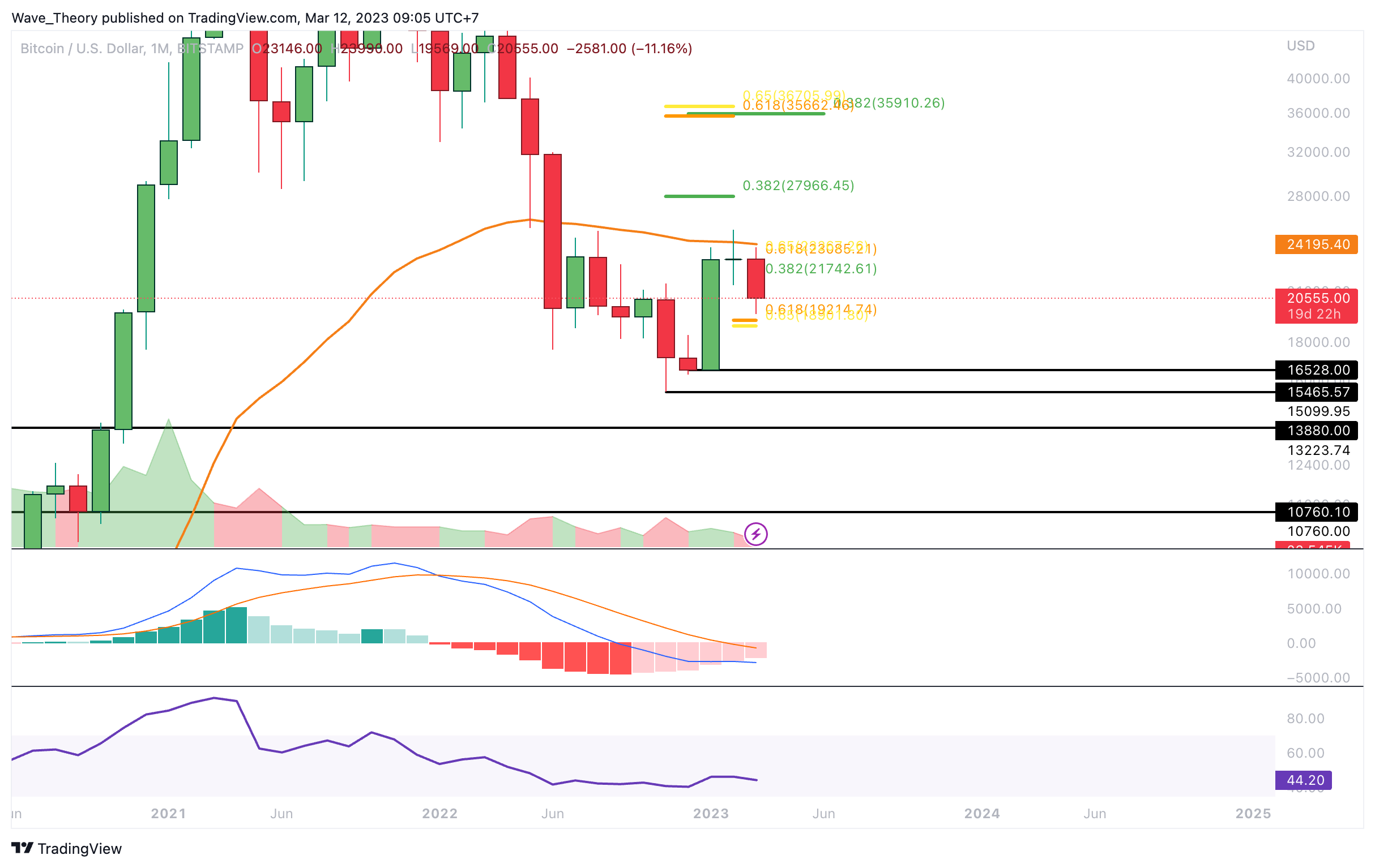 - Letzten Monat konnte Bitcoin nicht über dem 50-Monate-EMA Widerstand bei rund 24.270 USD schließen.