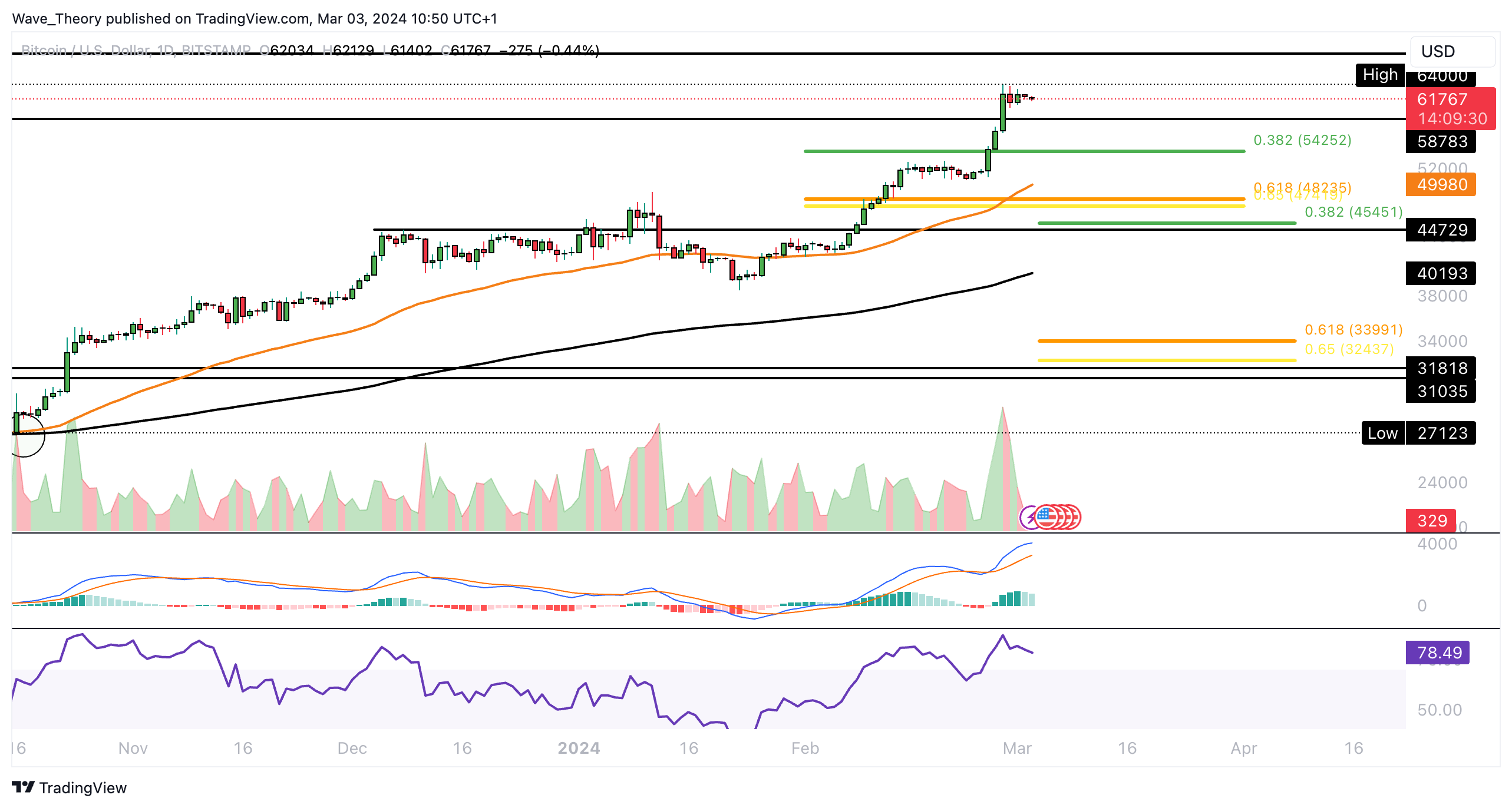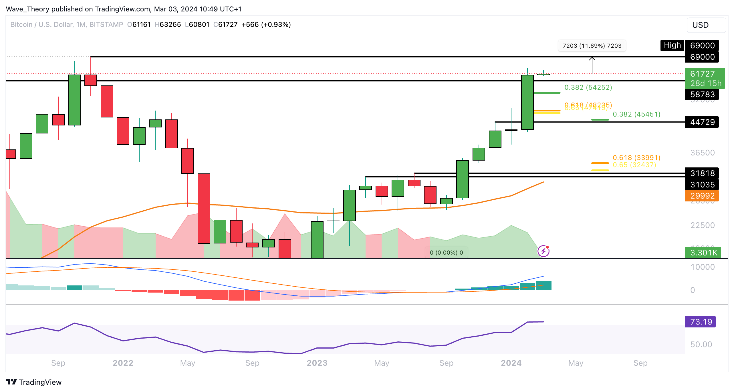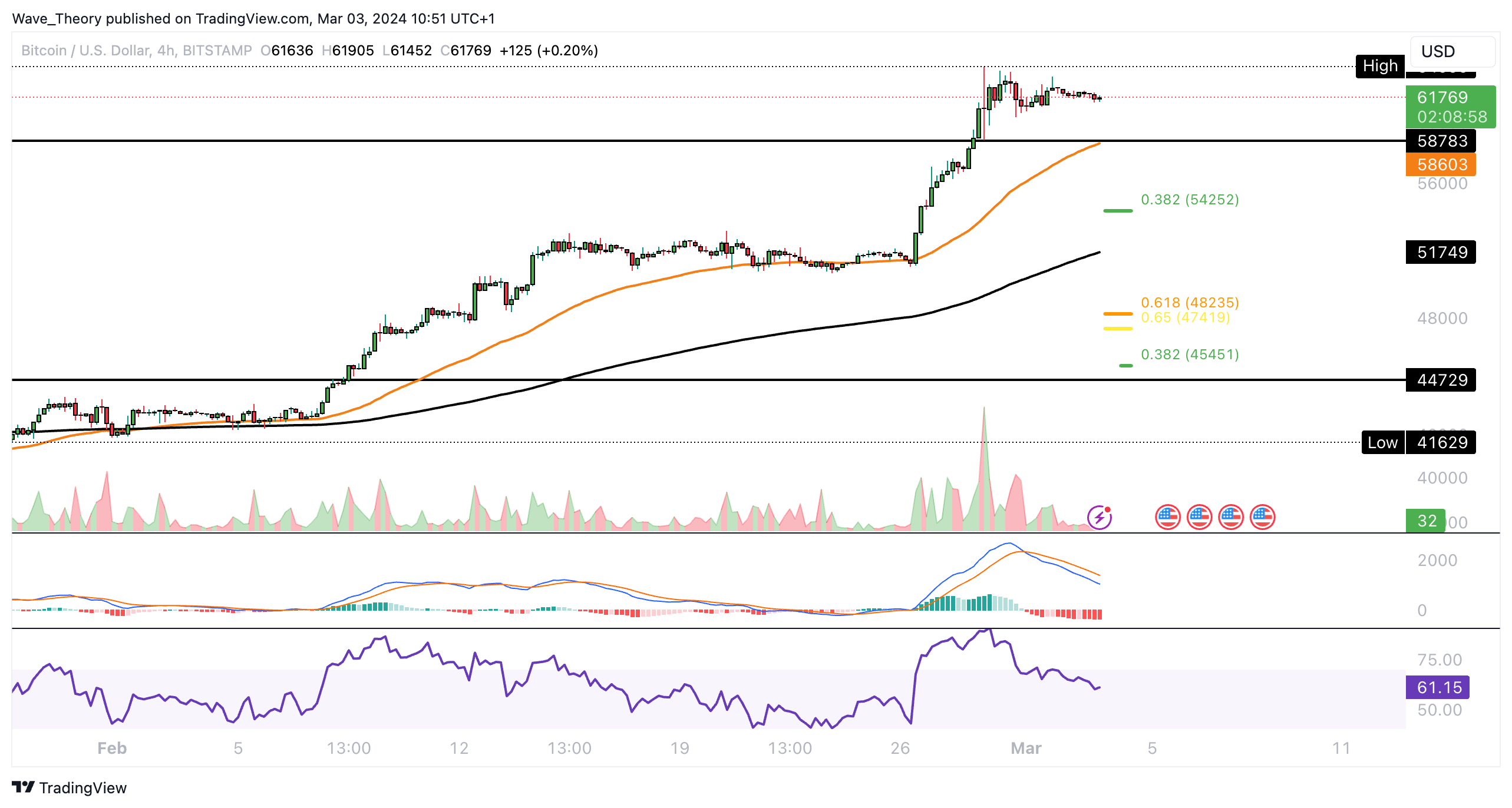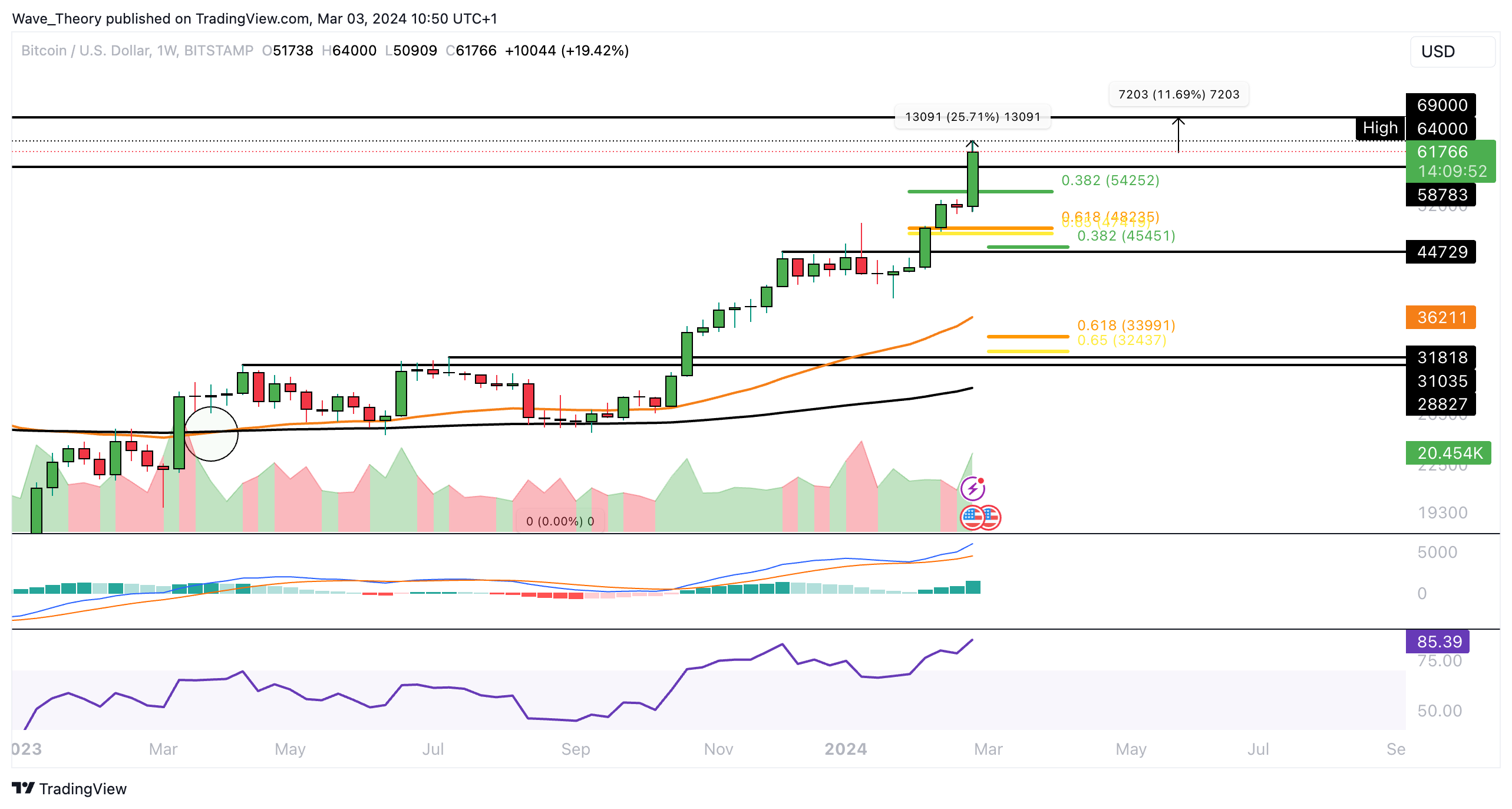 Der BTC Kurs befindet sich in der Widerstandszone zwischen rund 58.800 USD und 69.000 USD. Damit fehlen dem BTC Kurs nur noch 11,7 %, bis er das ATH bei rund 69.000 USD erreicht.