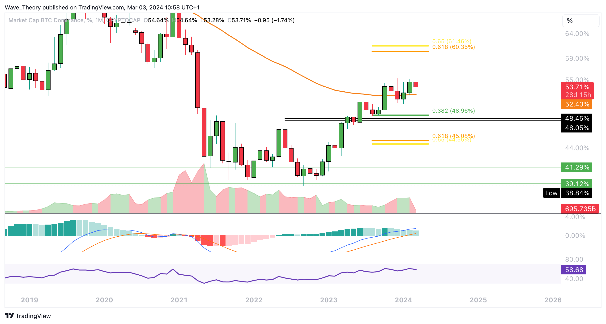 Es besteht die Möglichkeit, dass Bitcoins Dominanz den Fibonacci-Widerstandswert von etwa 60,5 % anpeilt. Eine signifikante Unterstützung findet sich beim 50-Monats-EMA, welcher sich auf rund 52,43 % beläuft.