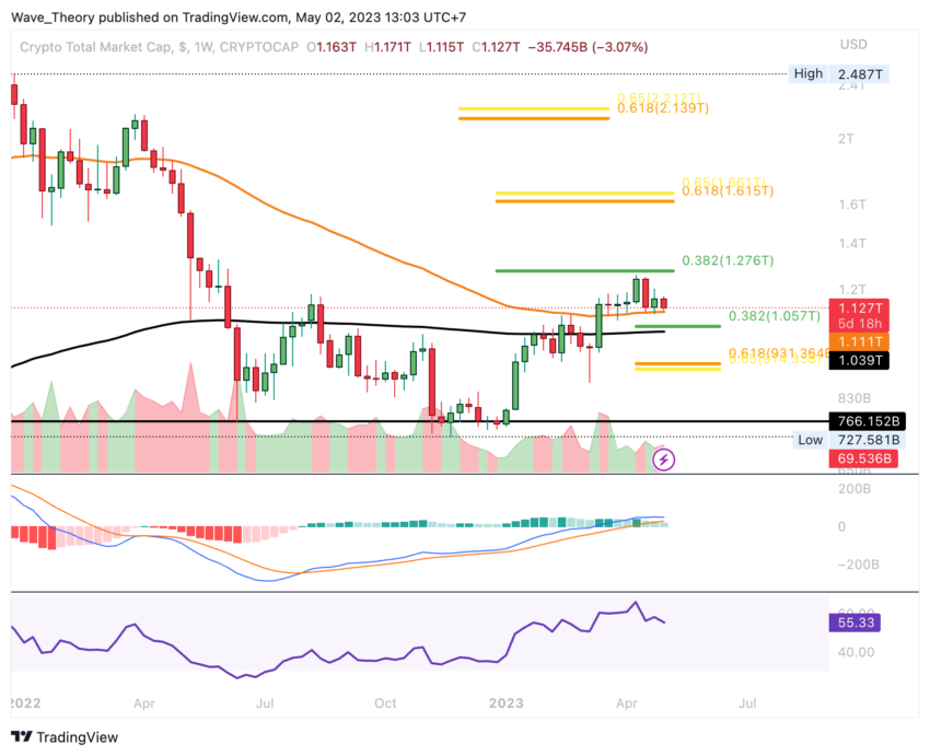 Der Kryptomarkt konnte sich letzte Woche über der 50-Wochen-EMA Unterstützung bei rund 1,11 Billionen USD halten. Wenn diese Unterstützung jetzt bricht, warten bei rund 1,05 Billionen USD und bei rund 930 Milliarden USD die nächsten signifikanten Fib Unterstützungen.