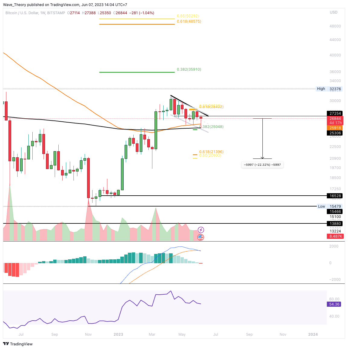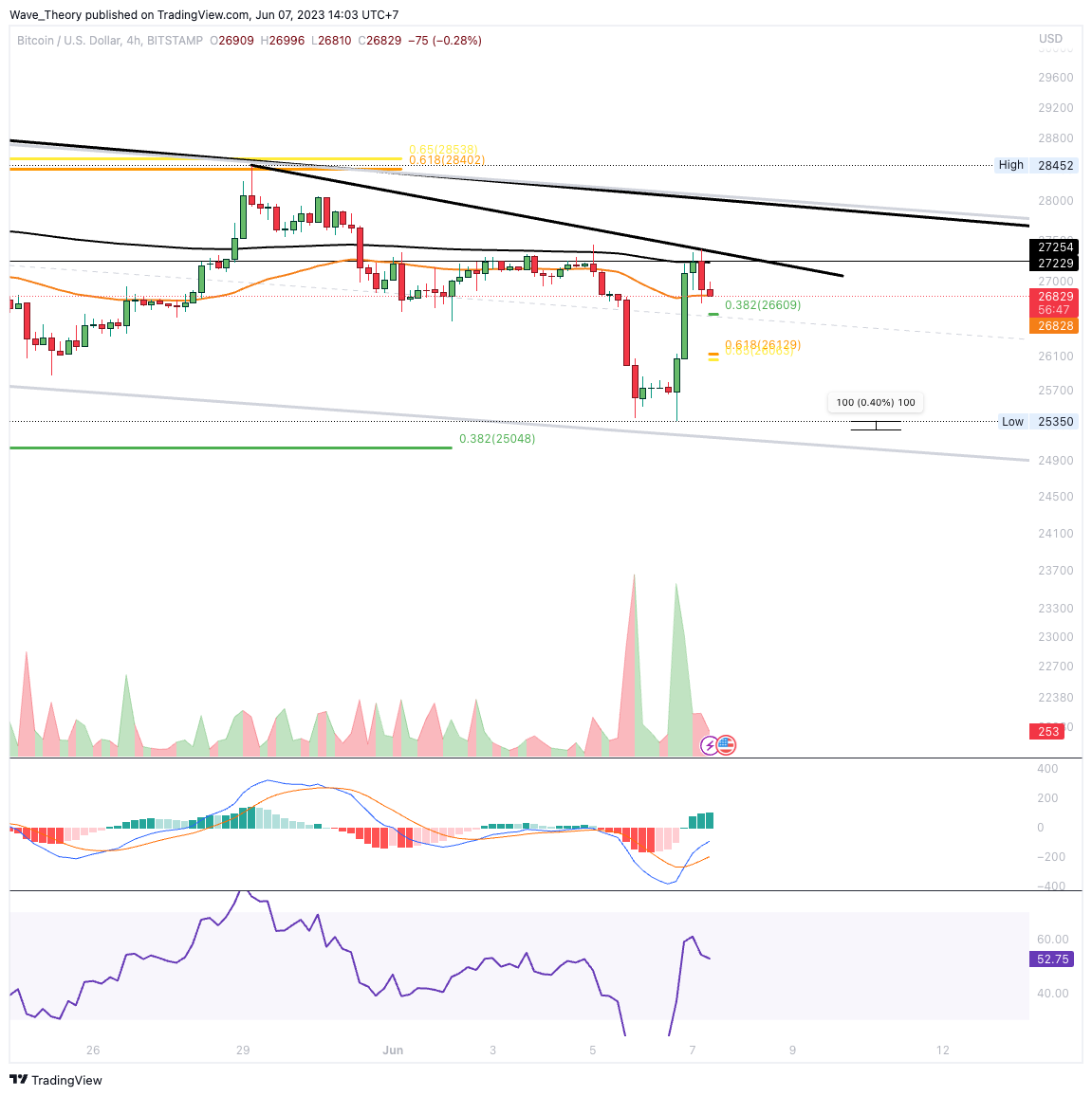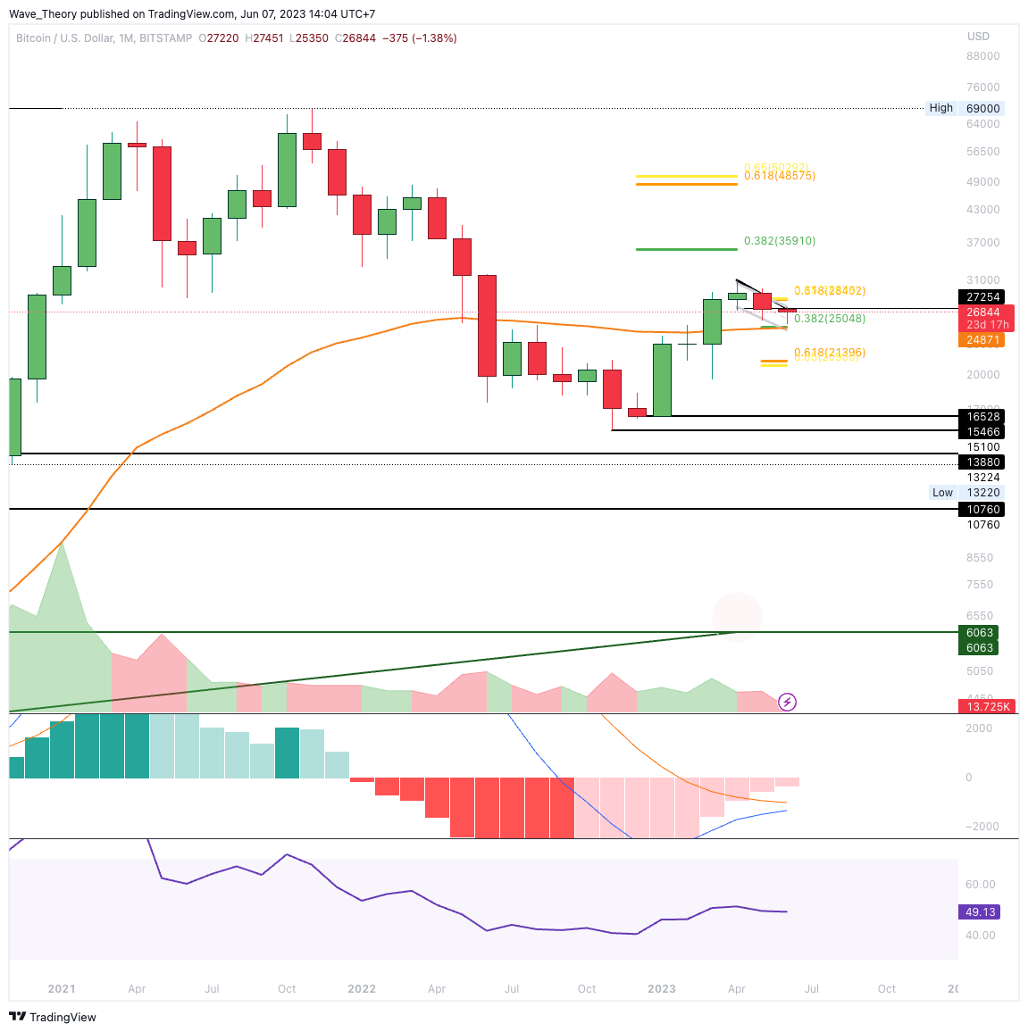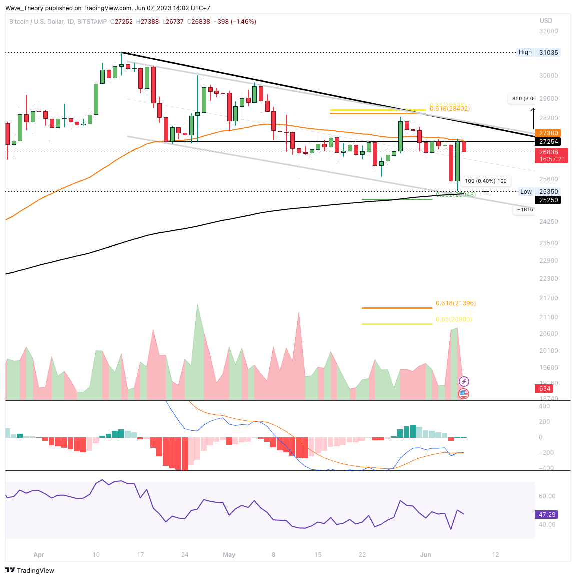 Nichtsdestoweniger scheint BTC heute am 50-Tage-EMA Widerstand bei rund 27.300 USD auf bärische Ablehnung zu stoßen. Damit könnte BTC die Abwärtsbewegung fortsetzen, um das 0,382 Fib Niveau bei rund 20.050 USD doch noch zu erreichen.