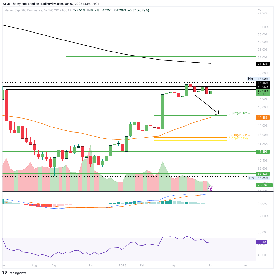 Letzte Woche wurde die Bitcoin Dominanz an dem Widerstand zwischen etwa 48 % und 48,5 % bärisch zurückgewiesen. Doch in dieser Woche beginnt sich die Bitcoin Dominanz bereits wieder zu erholen.