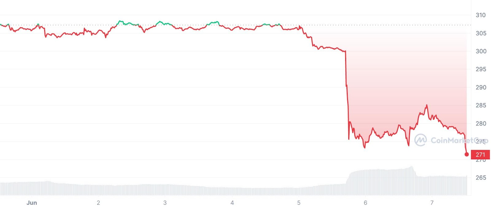 Der anhaltende Verkaufsdruck ließ BNB die 303- und 283-Dollar-Unterstützungsmarken durchbrechen und auf einen Wert von aktuell 271 Dollar fallen.