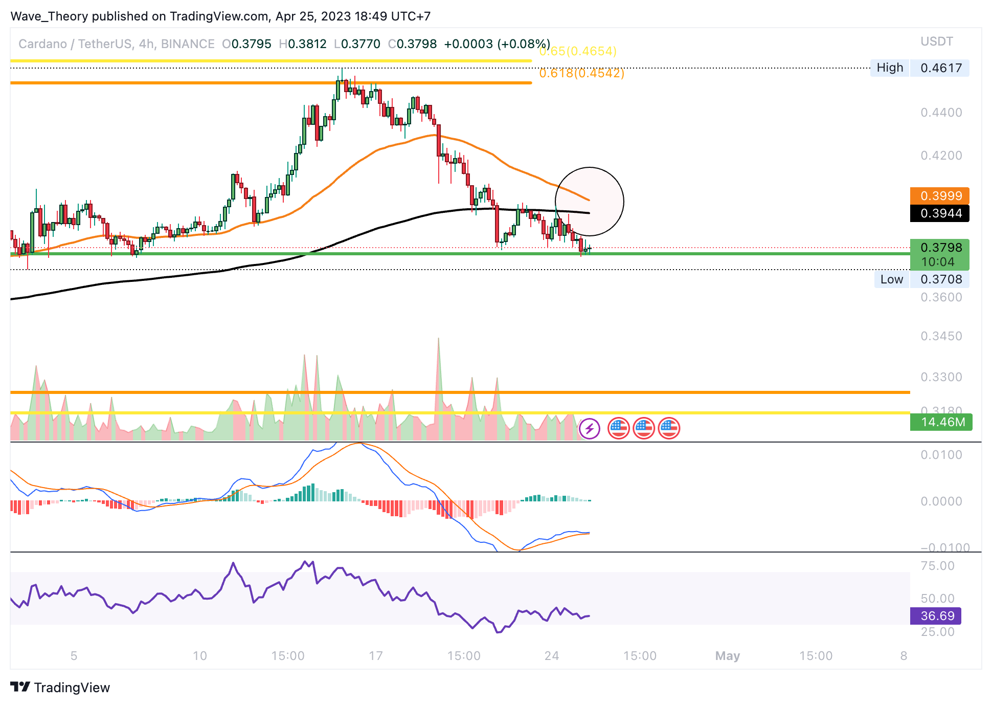 Der Cardano Kurs erreichte jetzt die signifikante Fibonacci Unterstützung bei rund 0,3774 USD, woran der Kurs bullisch abprallen könnte. Doch solange Cardano den Golden Ratio Widerstand bei rund 0,465 USD nicht überwindet, bleibt die Korrekturbewegung intakt.