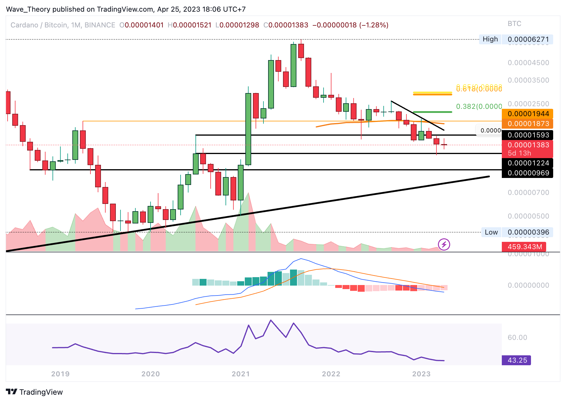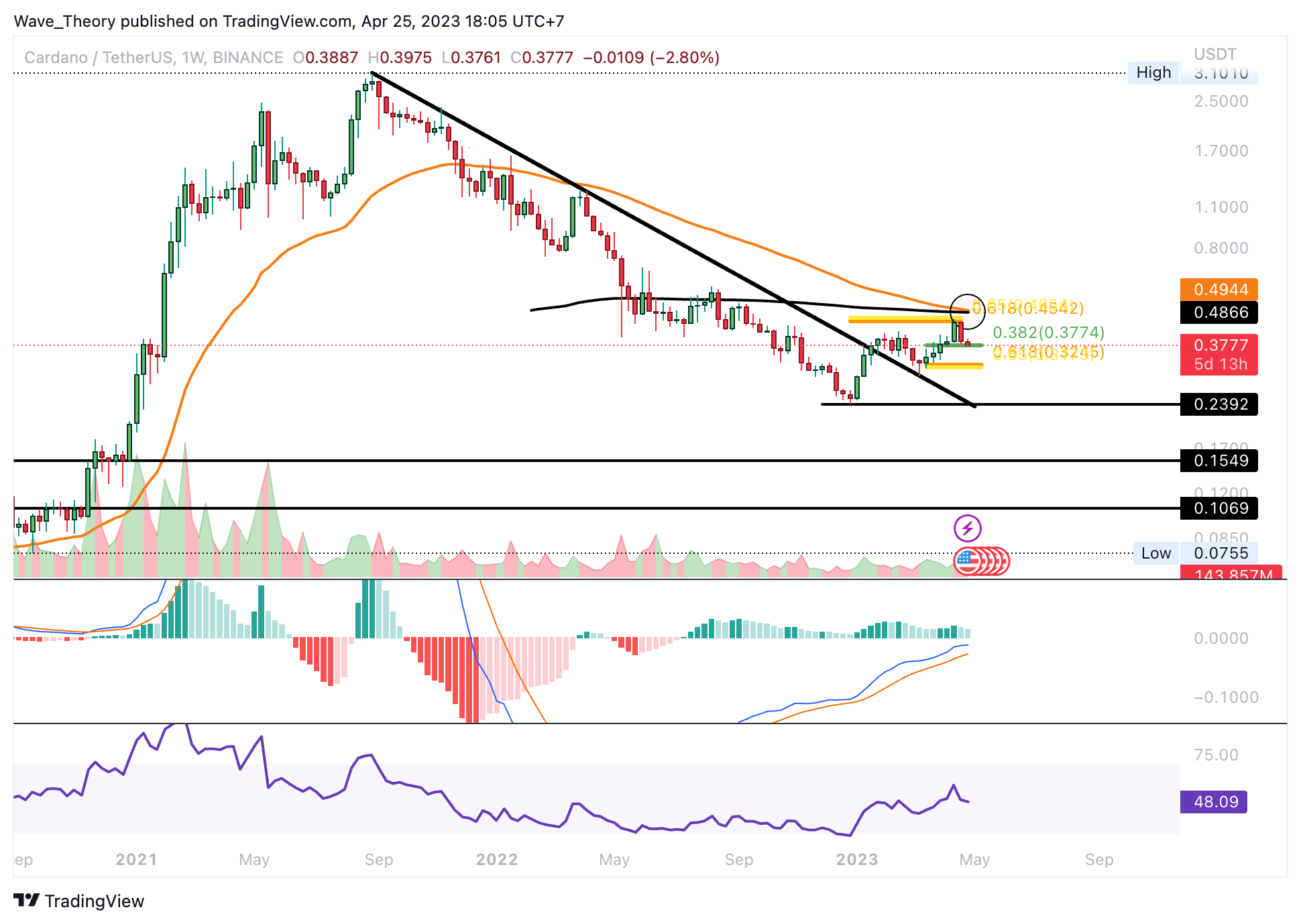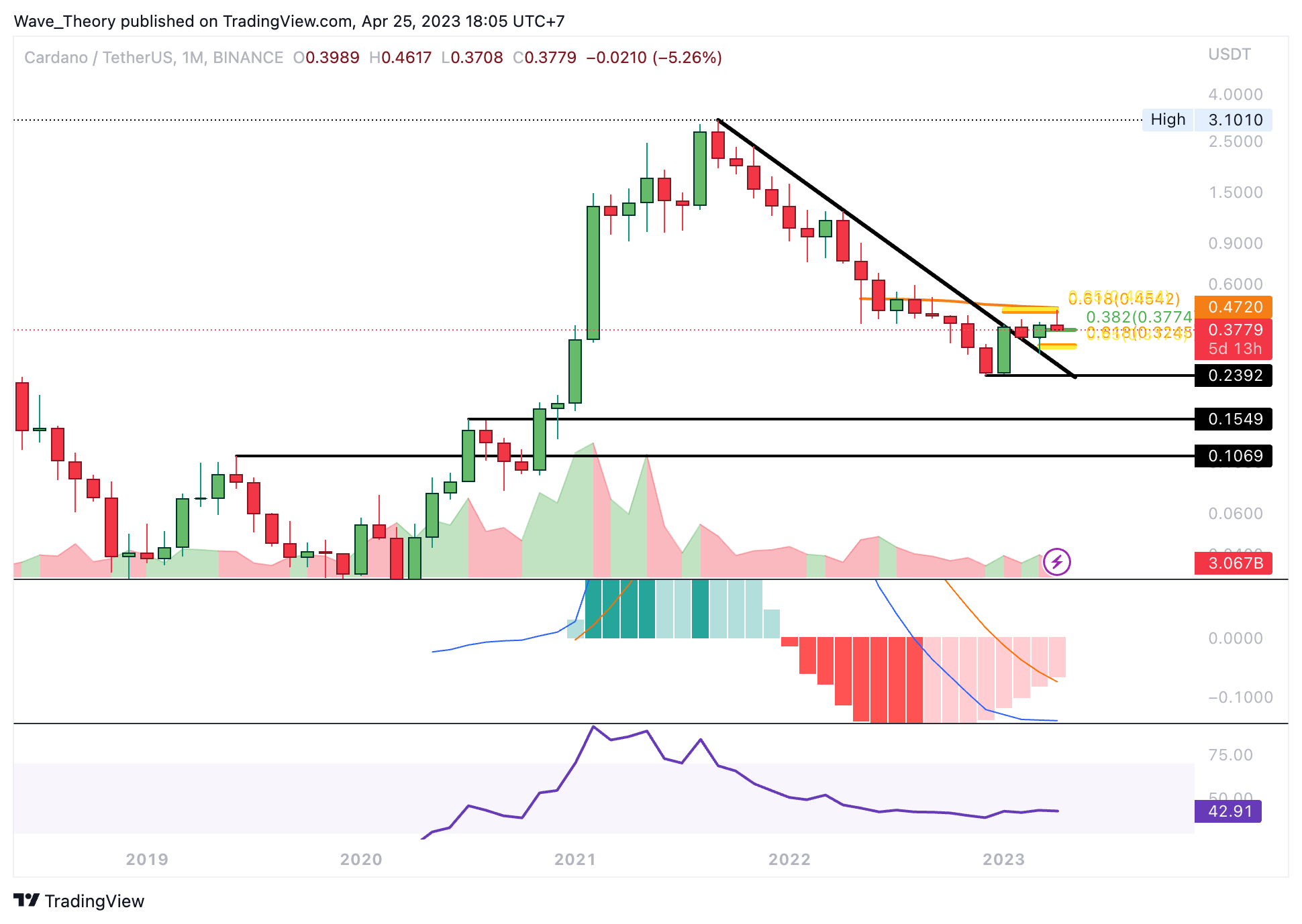 Obwohl der RSI neutral ist, zeigen die MACD Linien im Monatschart eine bärische Überkreuzung. Das Histogramm des MACDs steigt jedoch seit vielen Monaten bullisch an und deutet auf den Beginn einer bullischen Trendwende hin. Vor drei Monaten konnte Cardano die bärische Trendlinie des gesamten Abwärtstrends durchbrechen und als Unterstützung bestätigen, was definitiv ein sehr bullisches Zeichen für den Cardano Kurs ist.