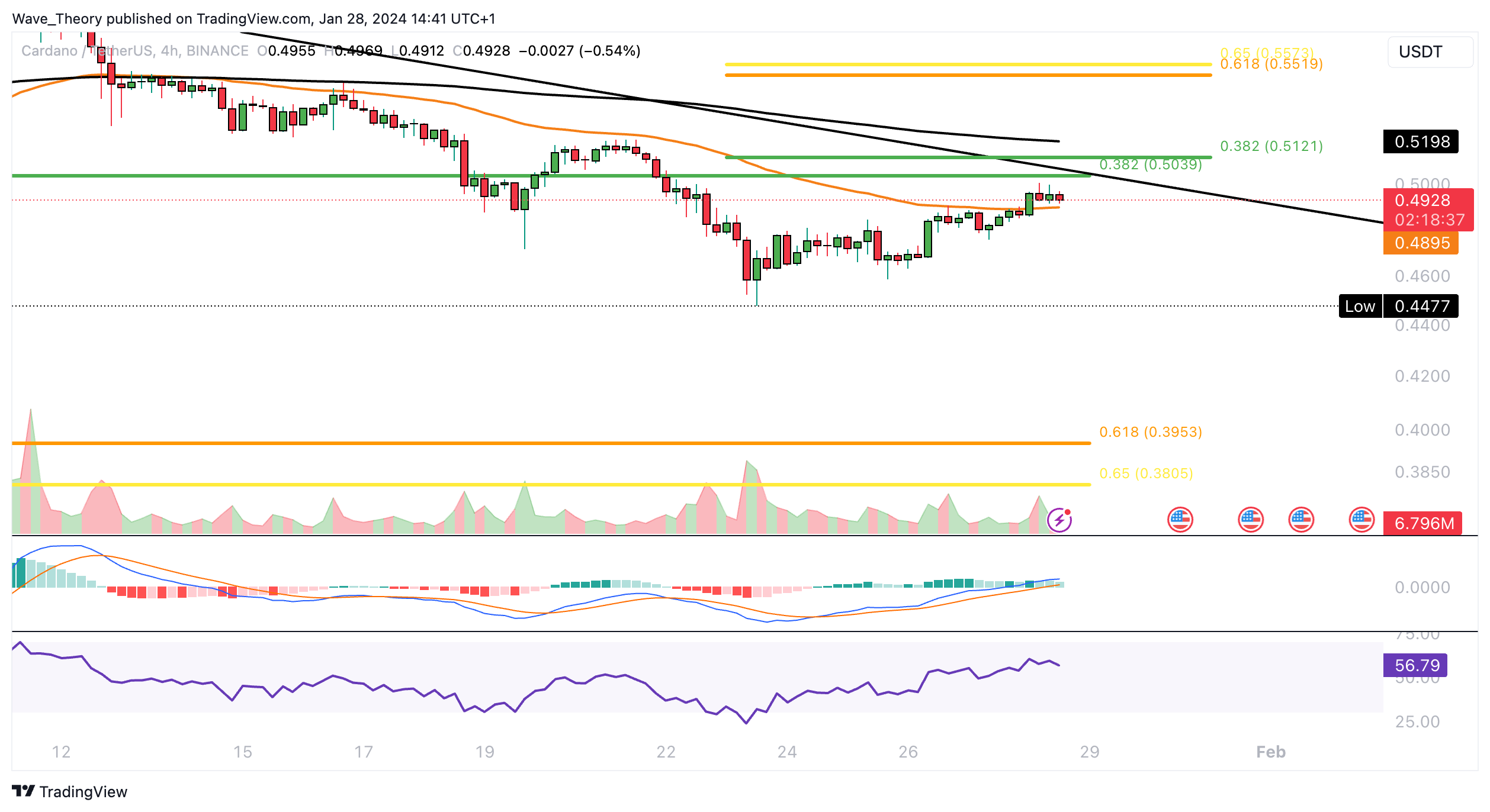 Cardano befindet sich drei Tagen in einer Aufwärtsbewegung. Doch jetzt stößt Cardano zwischen rund 0,5 USD und 0,514 USD auf signifikante Widerstände. Zum einen befinden sich dort zwei 0,382 Fib Niveaus, zum anderen verläuft dort der 50-Tage-EMA, welcher als zusätzlicher Widerstand fungiert.