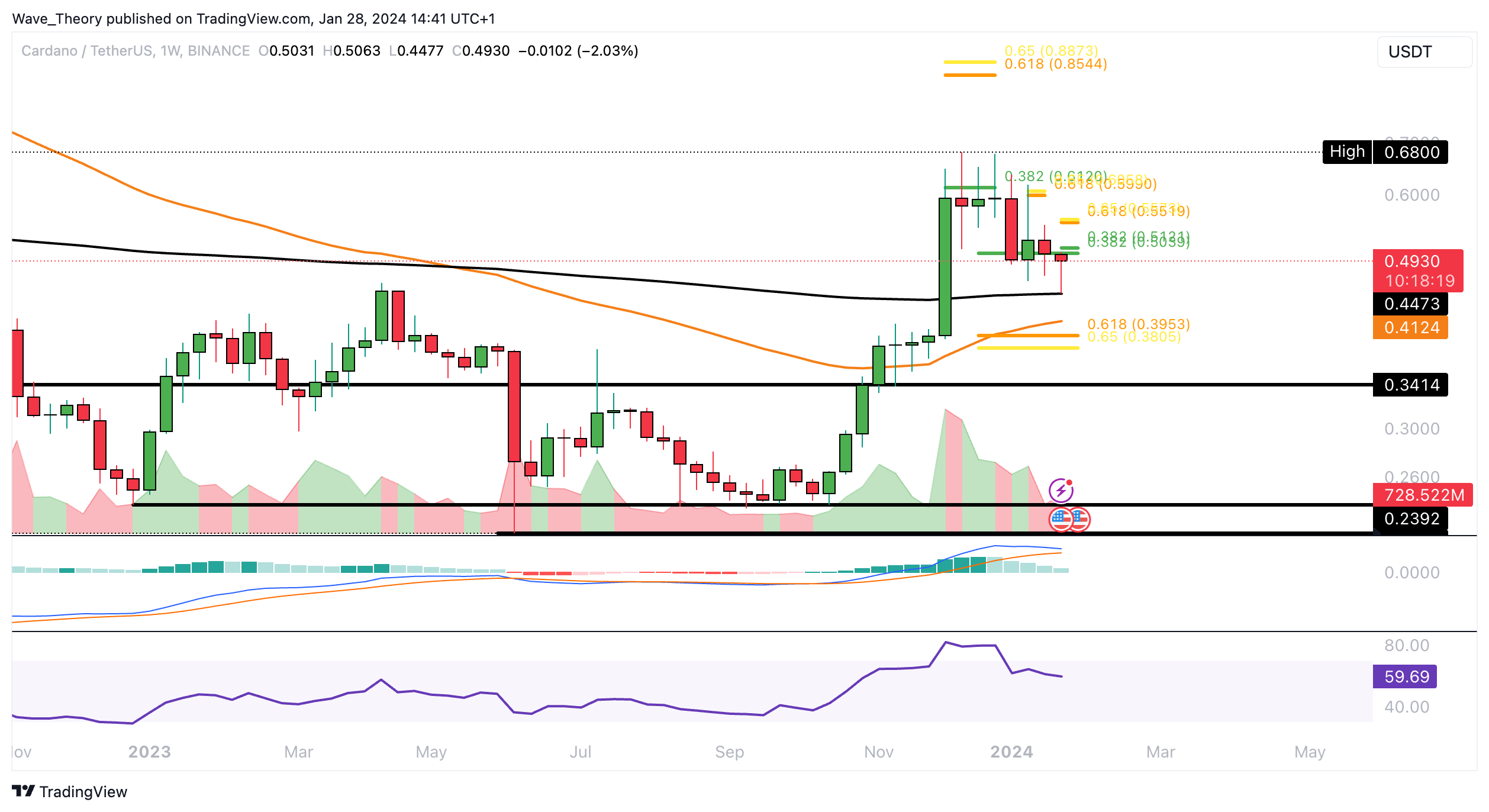 Der 50-Wochen-EMA fungiert dabei bereits bei rund 0,412 USD als signifikante Unterstützung.