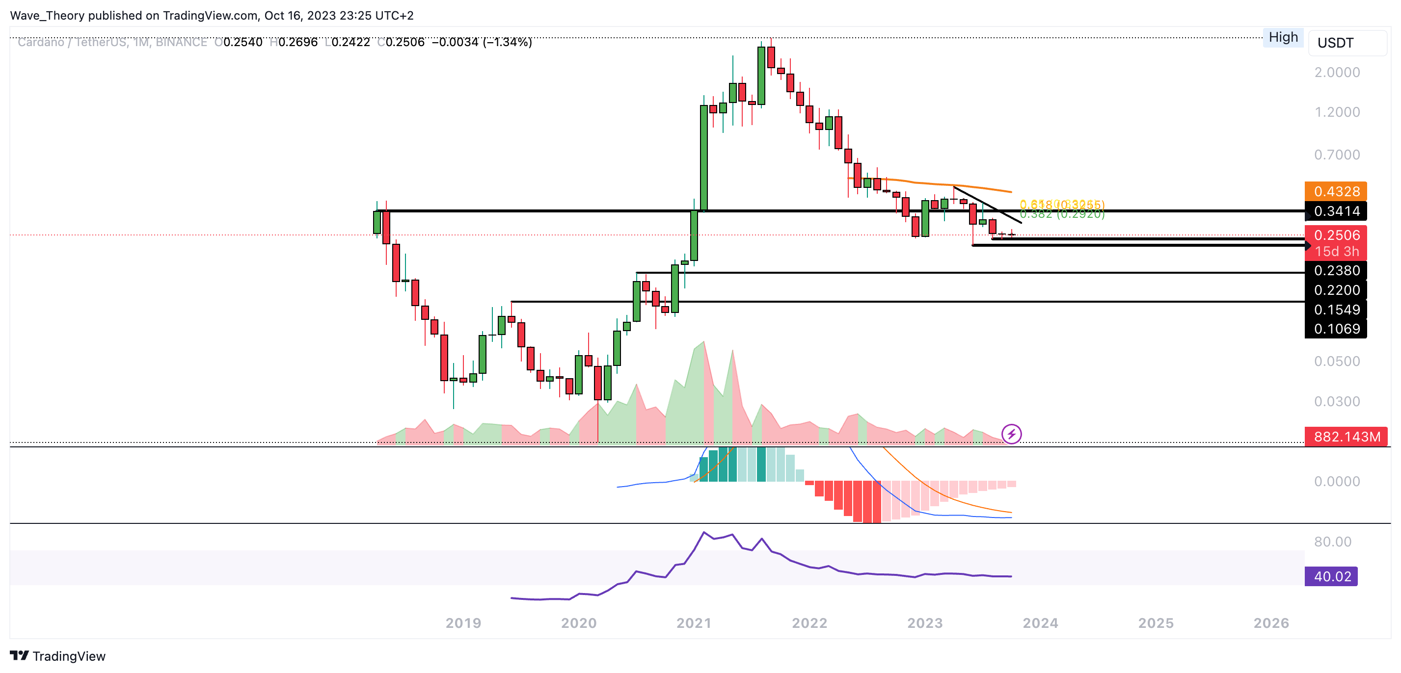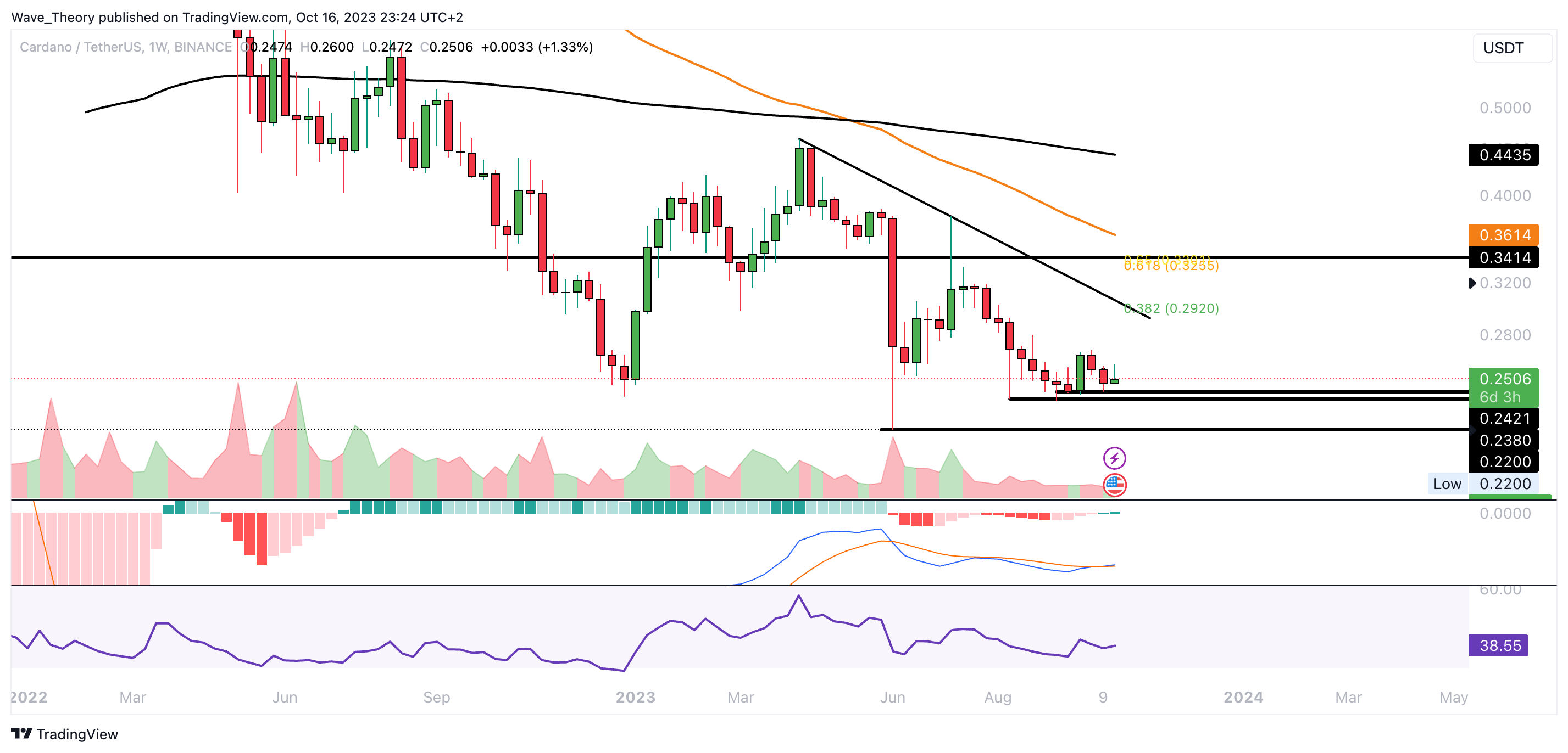 Im Wochenchart tickt das Histogramm des MACDs seit einigen Wochen bullisch höher. Die MACD Linien sind dabei bullisch überkreuzt und der RSI zeigt sich neutral. Wenn Cardano die Unterstützung zwischen rund 0,0238 USD und 0,242 USD bärisch bricht, wartet bei rund 0,22 USD die nächste signifikante Unterstützung.