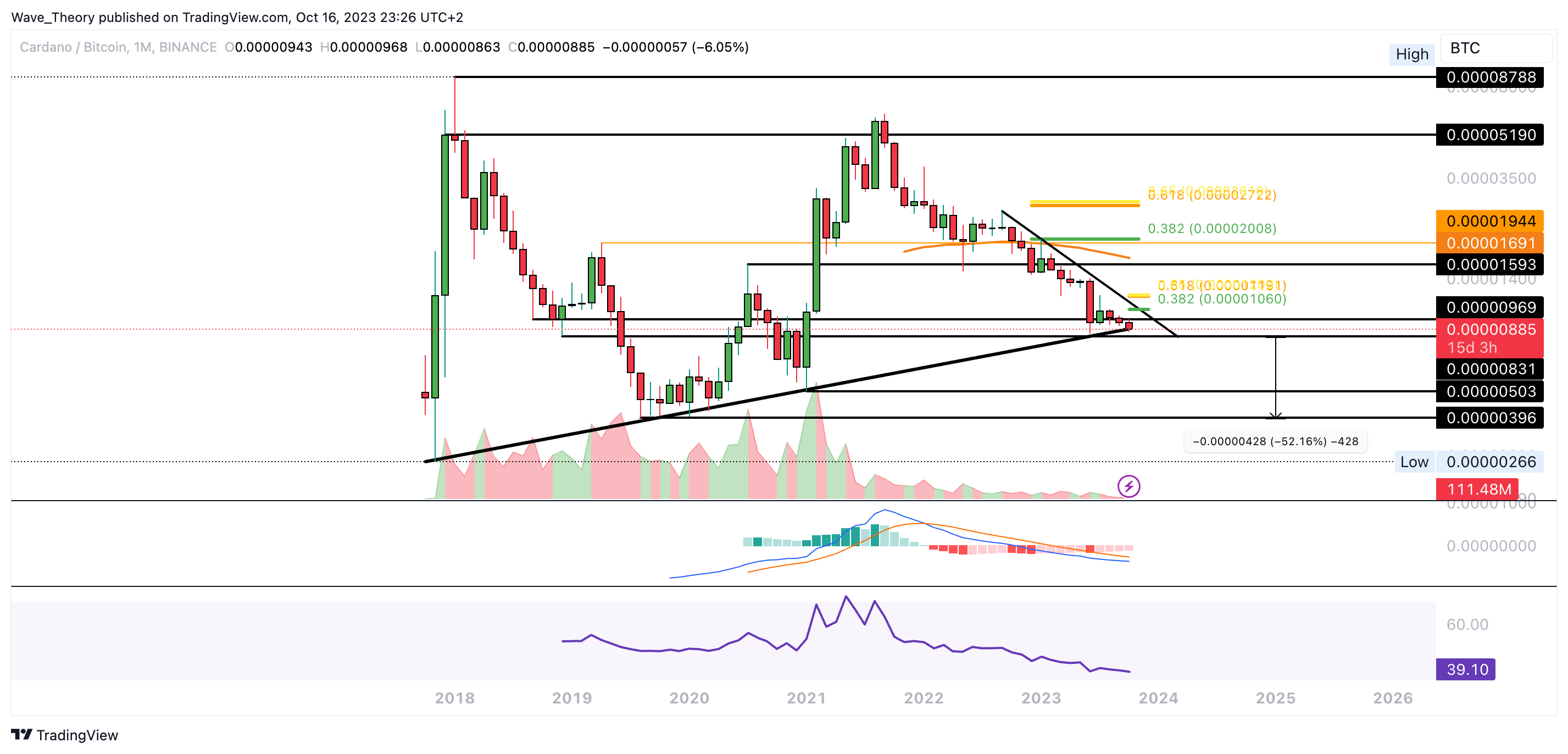 Auch gegen Bitcoin könnte der Cardano Kurs eine Etage tiefer fallen