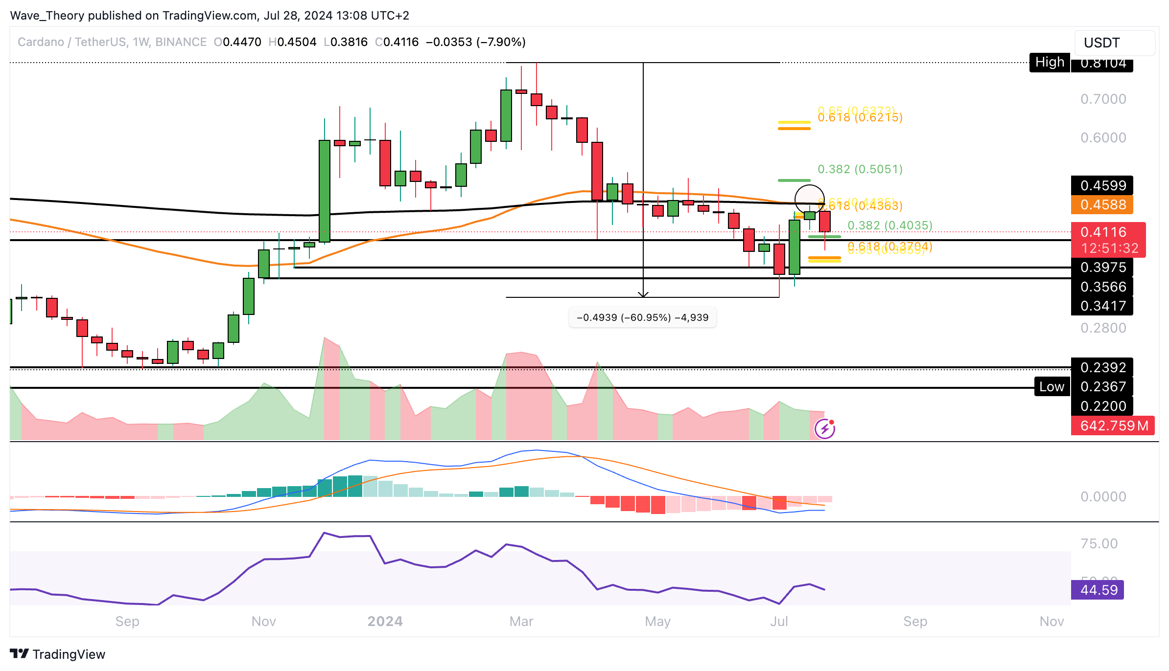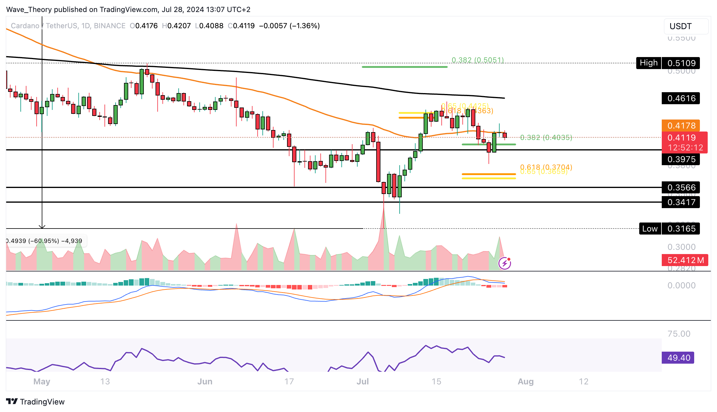 Der ADA Kurs stößt am 50-Tage-EMA bei rund 0,418 USD auf Widerstand. Dort scheint Cardano bärisch abgewiesen zu werden.