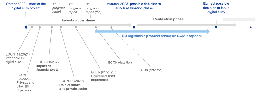 Panetta kündigte an, die EZB werde die Planung im Jahr 2023 fortsetzen und im Herbst abschließen. Erst zum Jahresende entscheidet der EZB-Rat über den Übergang in die Umsetzung und Erstellung eines Prototyps. Die Umsetzung bedeute jedoch noch nicht, den digitalen Euro bereits herauszugeben, sondern zuerst die technischen Lösungen und Geschäftsvorkehrungen zu entwickeln und testen.