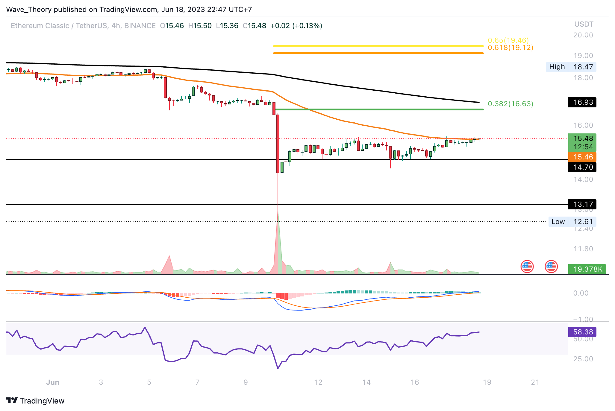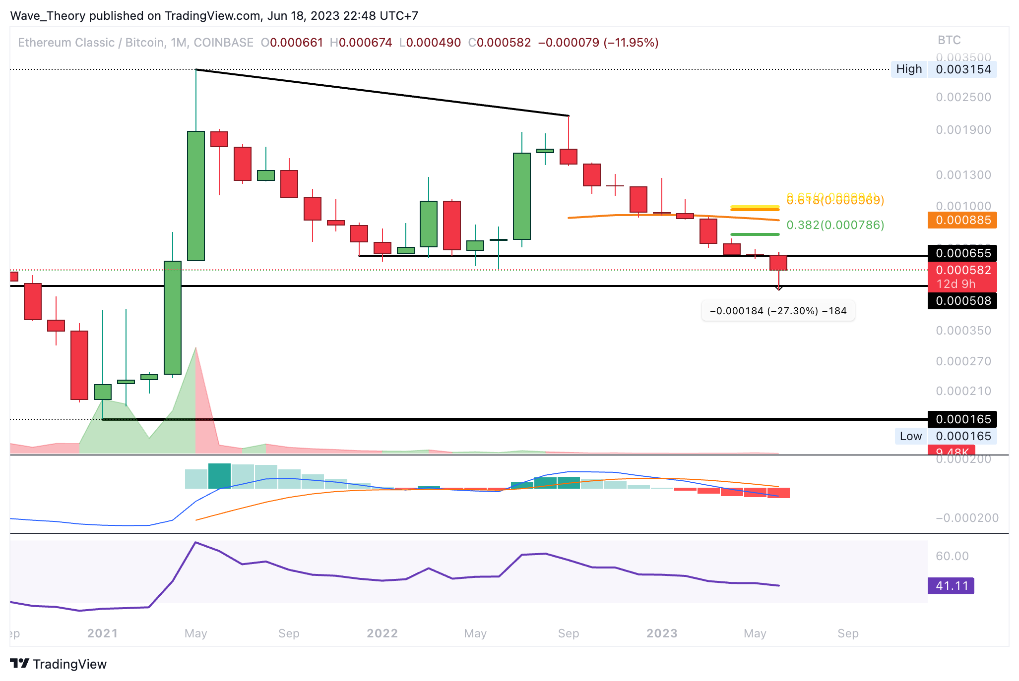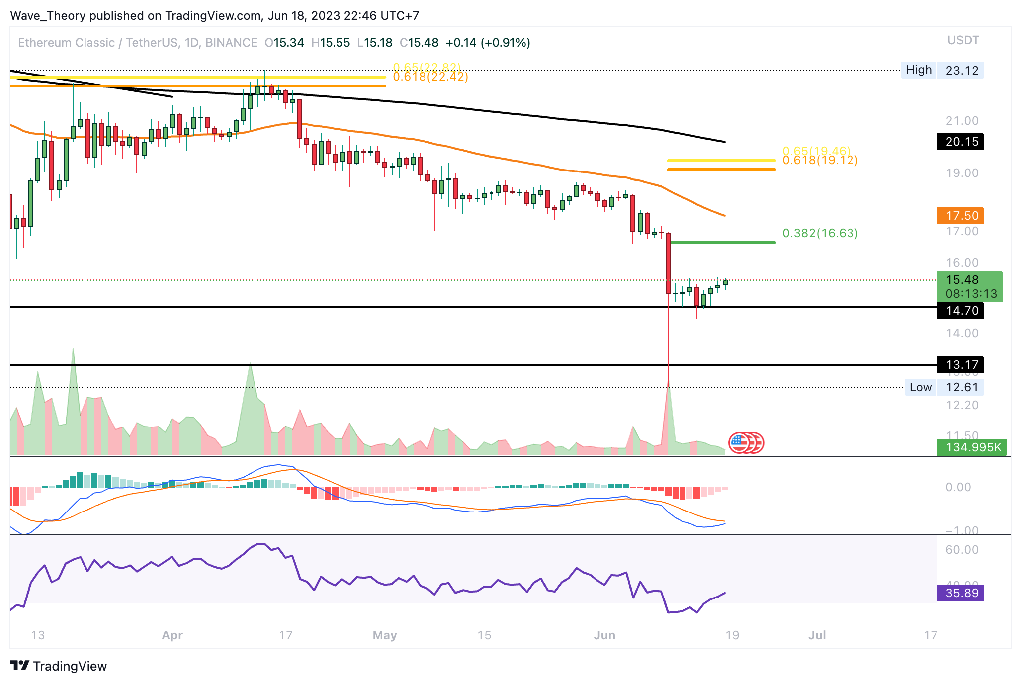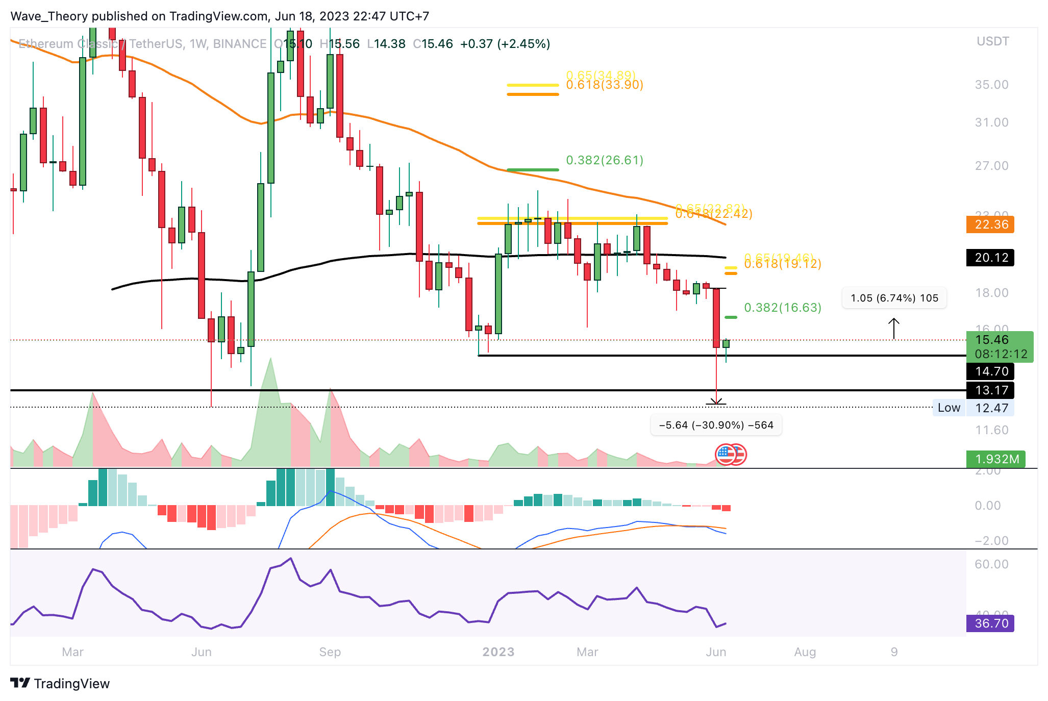 Damit könnte der ETC Kurs jetzt um rund 6,75 % steigen, um den 0,382 Fib Widerstand bei rund 16,6 USD zu erreichen. Jedoch zeigt sich der MACD im Wochenchart noch immer eindeutig bärisch. Denn das Histogramm des MACDs tickt bärisch tiefer und die MACD Linien sind bärisch überkreuzt.