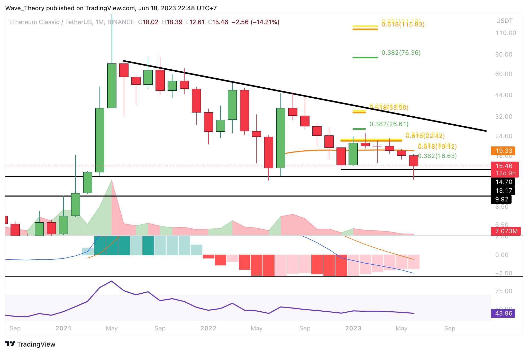In der letzten ETC Kurs Prognose schrieben wir: “Der Ethereum Classic (ETC) Kurs hat nun die 50-Monate-EMA Unterstützung bei rund 19,5 USD bärisch gebrochen. Damit befindet sich der ETC Kurs an der letzten Fib Unterstützung, bevor ETC eine Etage tiefer fallen könnte. Dann wartet erst wieder zwischen rund 13,2 USD und 14,7 USD signifikante Unterstützung.”