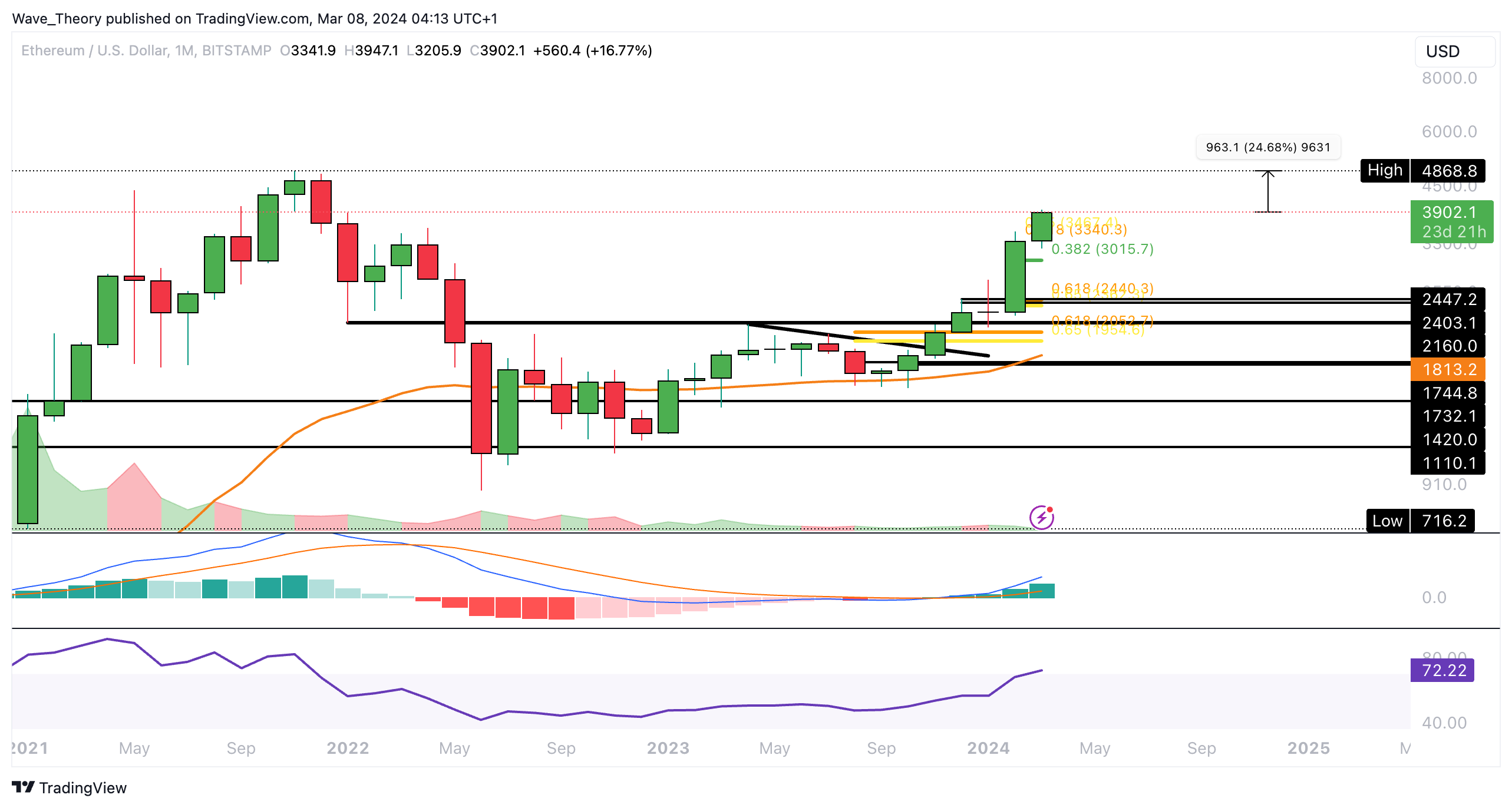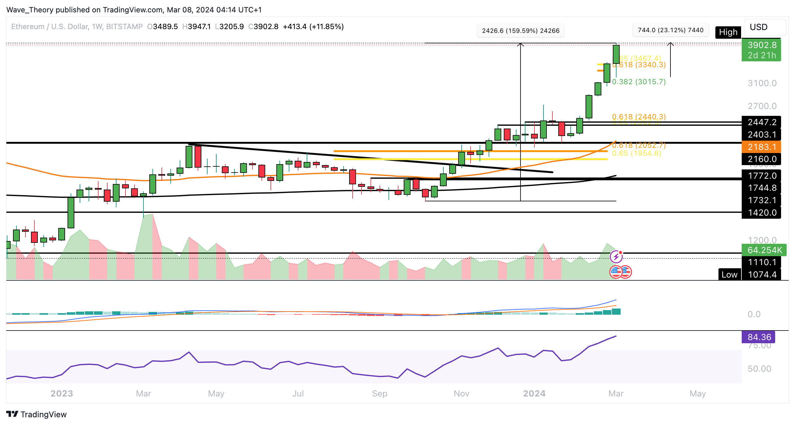 In der letzten Analyse erklärten wir, dass mit dem Bruch der Golden Ratio bei rund 3.400 USD Ethereum sich in einem neuen Bullenzyklus befindet. Damit könnte Ethereum das ATH anvisieren oder es gar übersteigen.