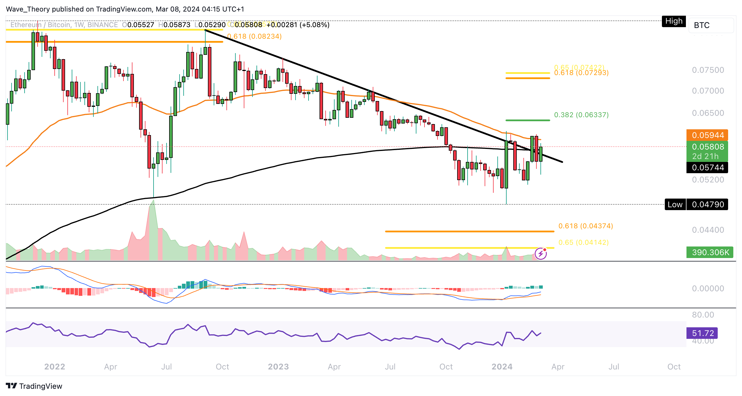 Gegen Bitcoin wurde Ethereum letzte Woche am 50-Wochen-EMA Widerstand bei rund 0,0594 BTC bärisch abgewiesen