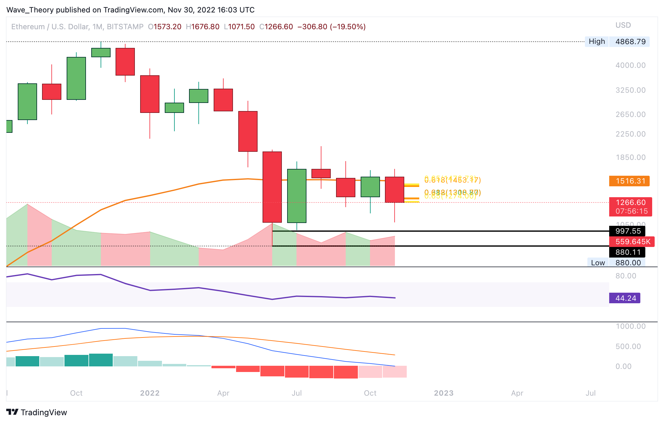 Auch im Monatschart tickt das Histogramm des MACDs nun wieder bullisch höher. Sollte Ethereum über der Golden Ratio Unterstützung bei rund 1.300 USD schließen in diesem Monat, wäre dies sehr bullisch für Ethereum.
