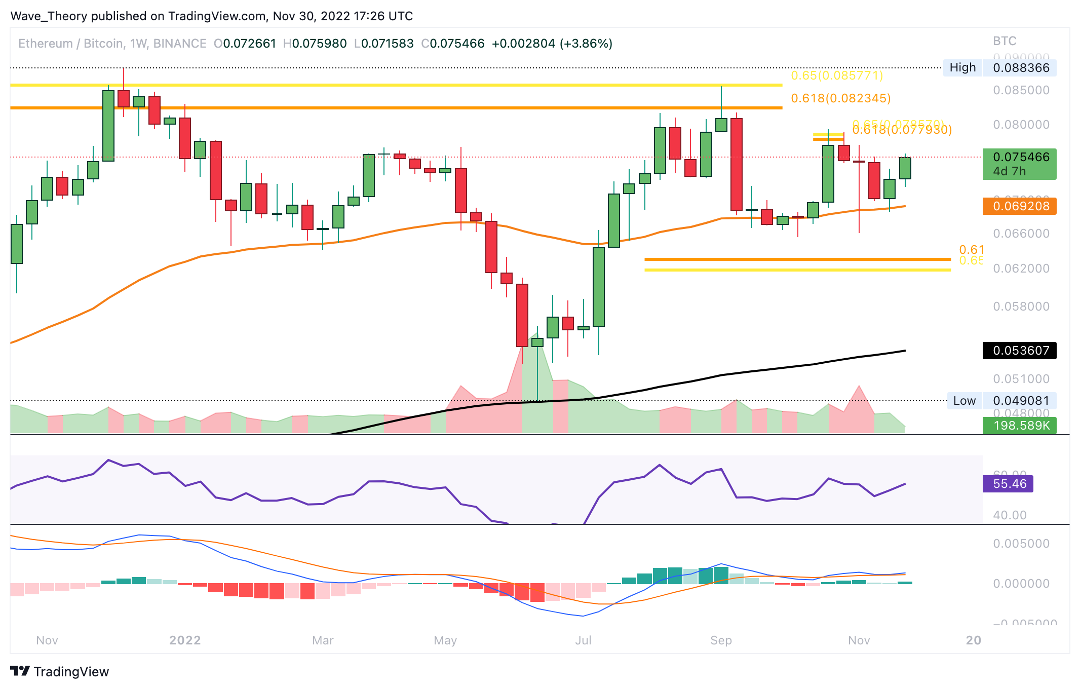Gegen BTC wurde der ETH Kurs zunächst am Golden Ratio Widerstand bei rund 0,078 BTC bärisch abgewiesen, woraufhin der ETH Kurs am 50-Wochen-EMA bei rund 0,069 BTC abprallen konnte. Damit könnte Ethereum jetzt erneut den Versuch unternehmen, den Goldne Ratio Widerstand bei rund 0,078 BTC zu brechen.