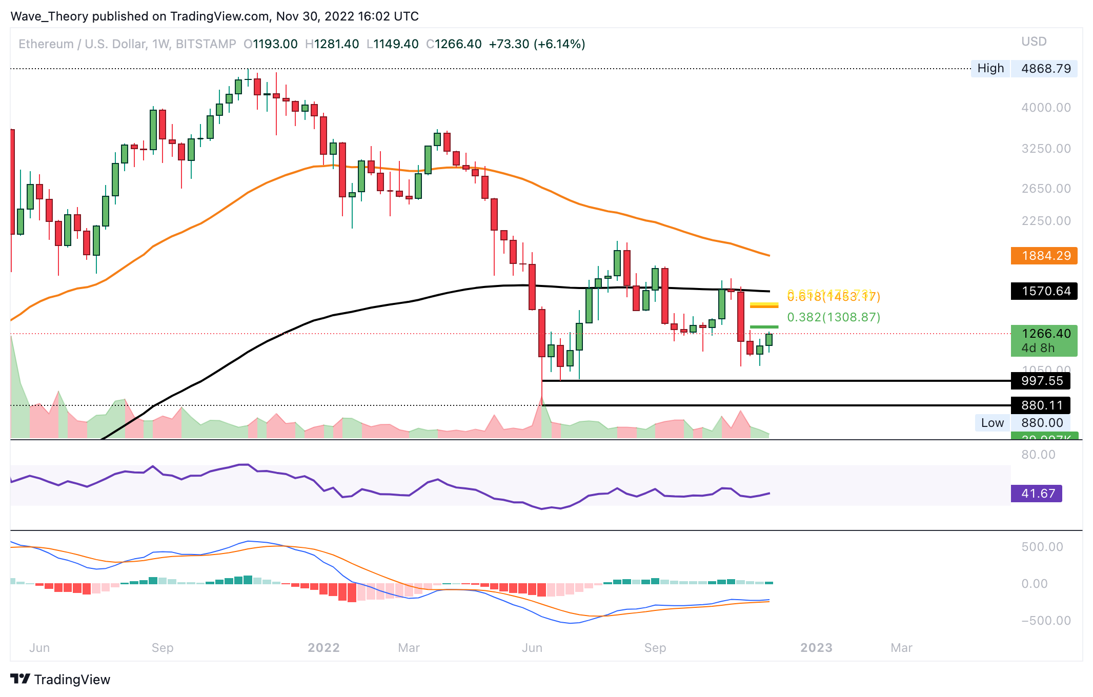 Sollte der ETH Kurs trotzdem an einem der Fib Widerstände bärisch abgewiesen werden, findet Ethereum spätestens zwischen 880 USD und 1.000 USD signifikante Unterstützung.