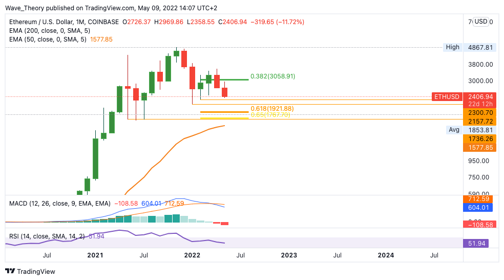 Bricht der Ethereum Kurs die Unterstützung zwischen 2.150 – 2.300 USD bärisch, wird Ethereum unweigerlich einen neuen lokalen Tiefpunkt formen. Dieser könnte sich zwischen 1.600 – 1.950 USD einpendeln, denn dort stößt der Ethereum Kurs auf die größte und wichtigste Unterstützung in diesem Zyklus. Dort trifft Ethereum auf die wichtige Golden Ratio Unterstützung und den 200-Wochen-EMA. Sollte Ethereum also die Unterstützung zwischen 2.150 – 2.300 USD brechen, wird er womöglich zwischen 1.600 – 1.950 USD seinen Boden finden. Dieses Preisniveau ist ein heißer Kandidat für den Ethereum Kurs, um der Korrektur ein Ende zu setzen. Denn an diesem Preisniveau wird der ETH Kurs mit hoher Wahrscheinlichkeit sehr stark abprallen.