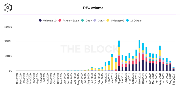 In den letzten Monaten ging das Handelsvolumen der dezentralisierten Ethereum-Exchanges (DEX) deutlich zurück. Im September fiel das Handelsvolumen sogar auf das Niveau vom Dezember 2020. Auch nach dem Merge wird sich dieser Trend wahrscheinlich erstmal nicht ändern.