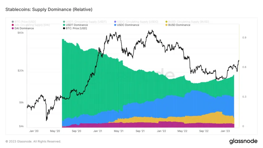 Auch die Stablecoin Dominanz von Tether erreichte ein neues 18-Monatshoch – mit fast 60 % Marktanteil liegt der Stablecoin weit vor der Konkurrenz. Nach den beeindruckenden Gewinnzahlen im vierten Quartal 2022 ist dies ein weiteres starkes Zeichen für die Zukunft des Unternehmens.