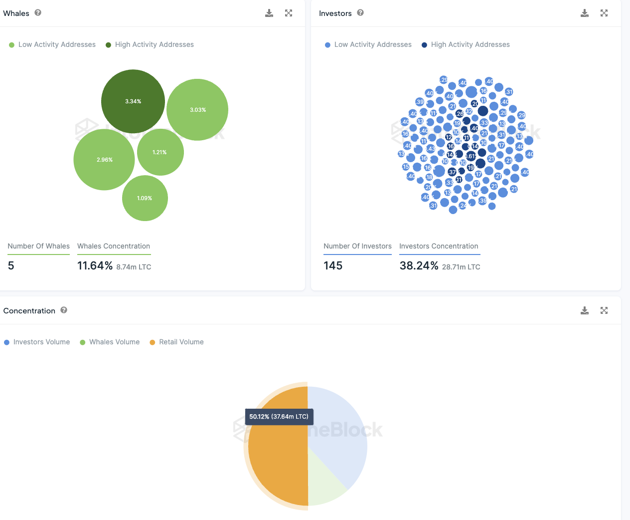 Mehr als die Hälfte aller LTC-Tokens (50,12 %) sind im Eigentum von Kleininvestoren. Demgegenüber steht, dass fünf sogenannte Wal-Adressen, von denen jede über 1 % des Gesamtangebots beherrscht, gemeinsam fast 11,64 % aller LTC Tokens halten.