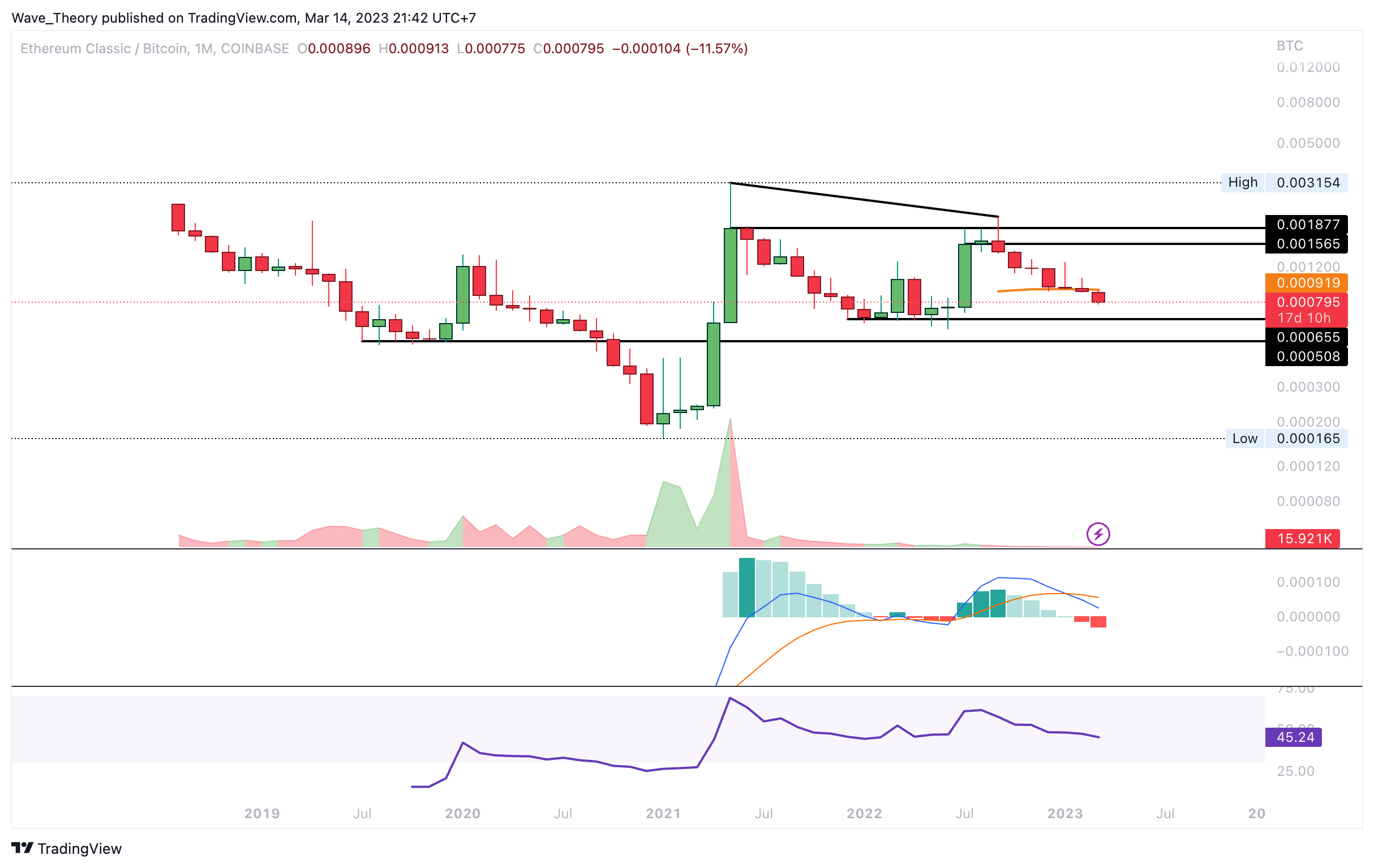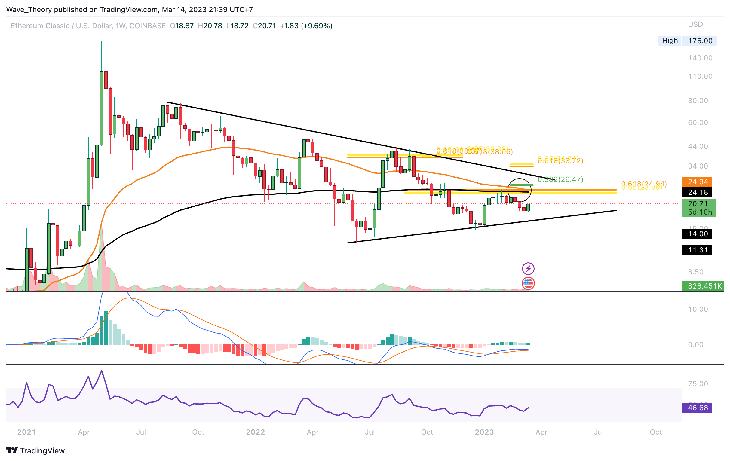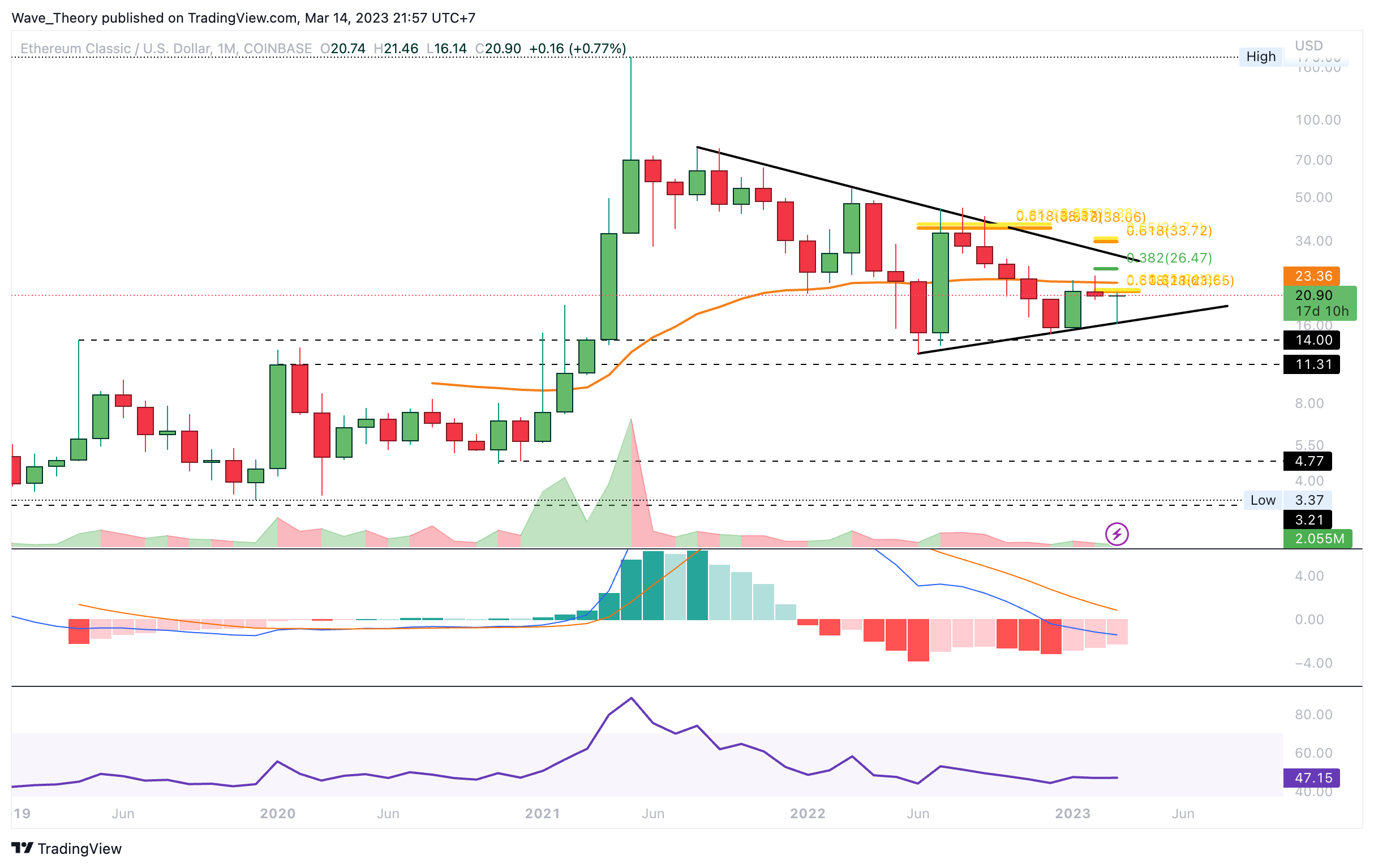Der ETC Kurs wurde im Januar am Golden Ratio bei rund 22,5 USD bärisch abgewiesen. Auch im Februar konnte ETC den Golden Ratio Widerstand nicht brechen. In diesem Monat folgte dann die starke bärische Ablehnung, woraufhin der ETC Kurs bis rund 16,14 USD korrigierte. Dabei formte ETC einen höheren Tiefpunkt und damit eine Serie an höheren Tiefpunkten im Monatschart.