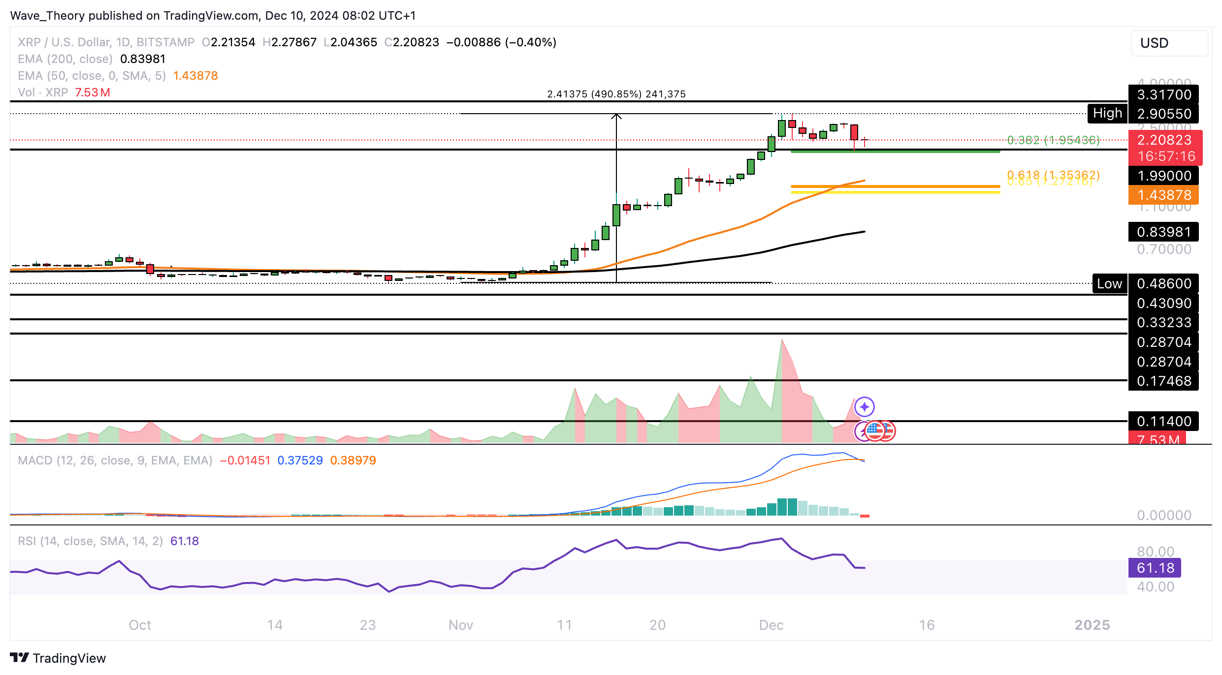 Ripple stößt jetzt zwischen rund 1,99 USD und 3,317 USD auf signifikanten Widerstandsbereich, nachdem der Preis um mehr als 490 % gestiegen ist. Dabei tickt das Histogramm des MACDs bullisch höher und die MACD Linien sind bullisch überkreuzt.