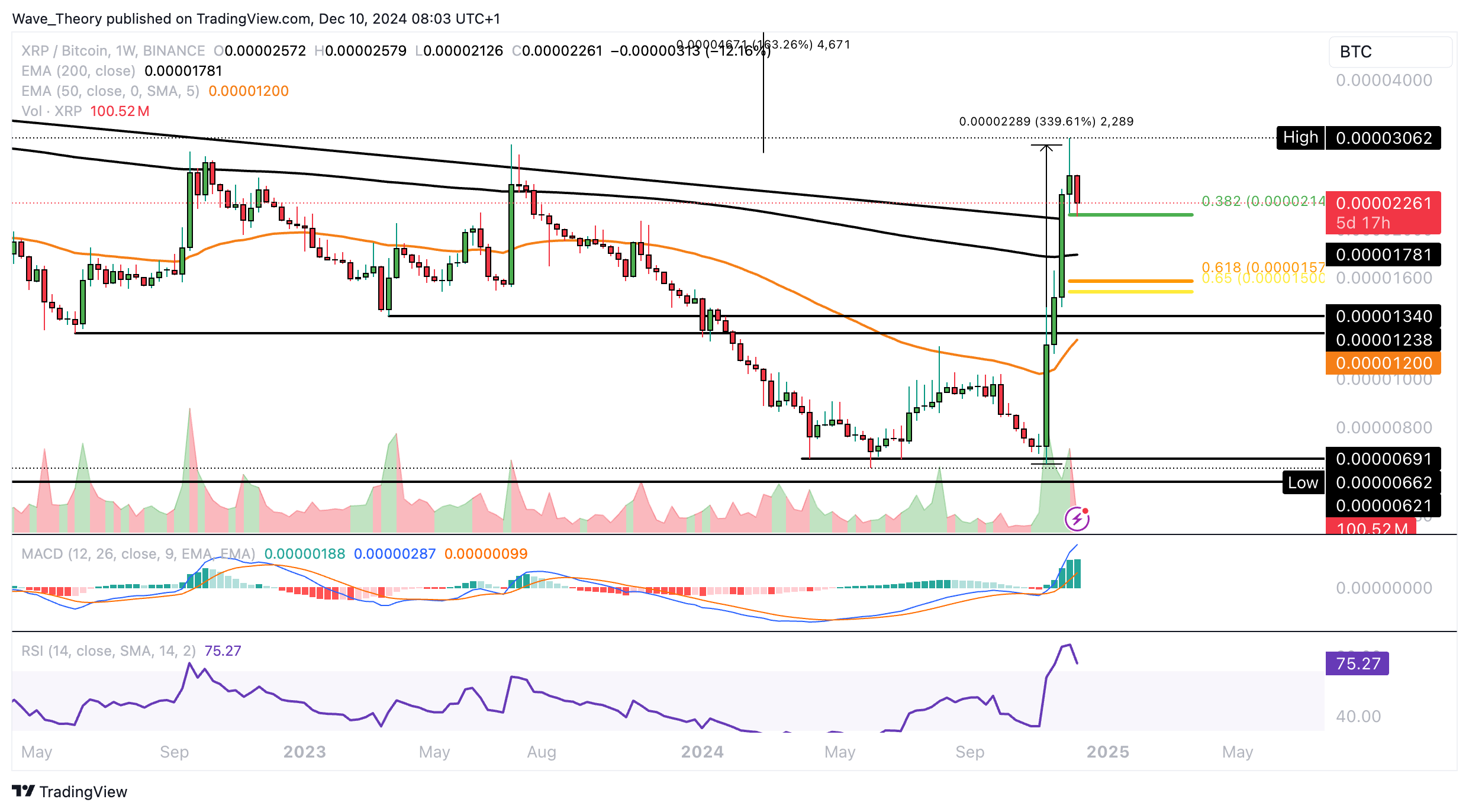 Wenn Ripple diese bricht, wartet bei rund 0,0000155 BTC die nächste signifikante Fib Unterstützung. Insgesamt zeichnen die Indikatoren im Wochenchart aber ein gemischtes Bild ab.