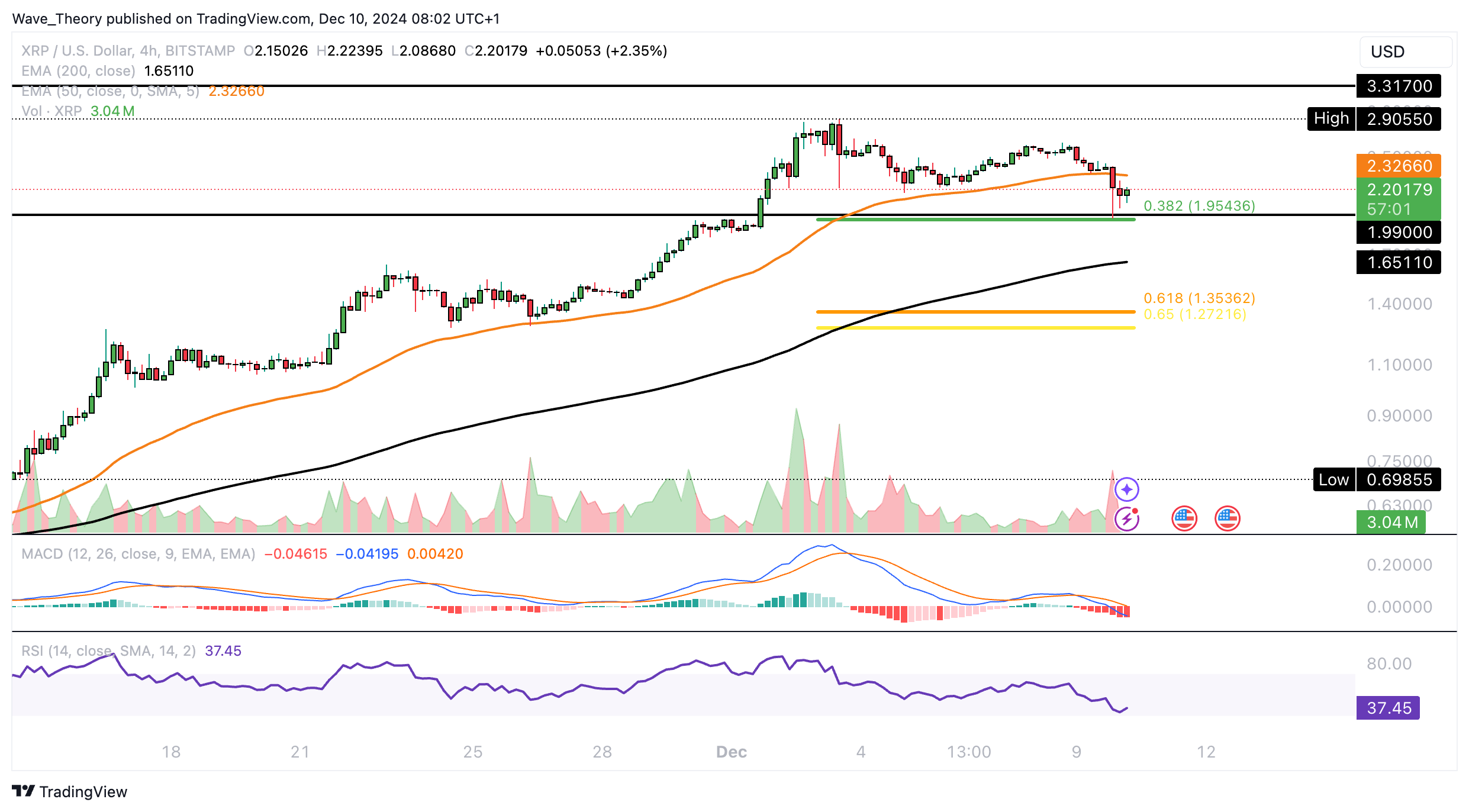 Der XRP Kurs setzt jetzt zur Korrektur an. Er findet dabei bei rund 1,955 USD und bei rund 1,35 USD die nächsten signifikanten Fibonacci Unterstützungen.